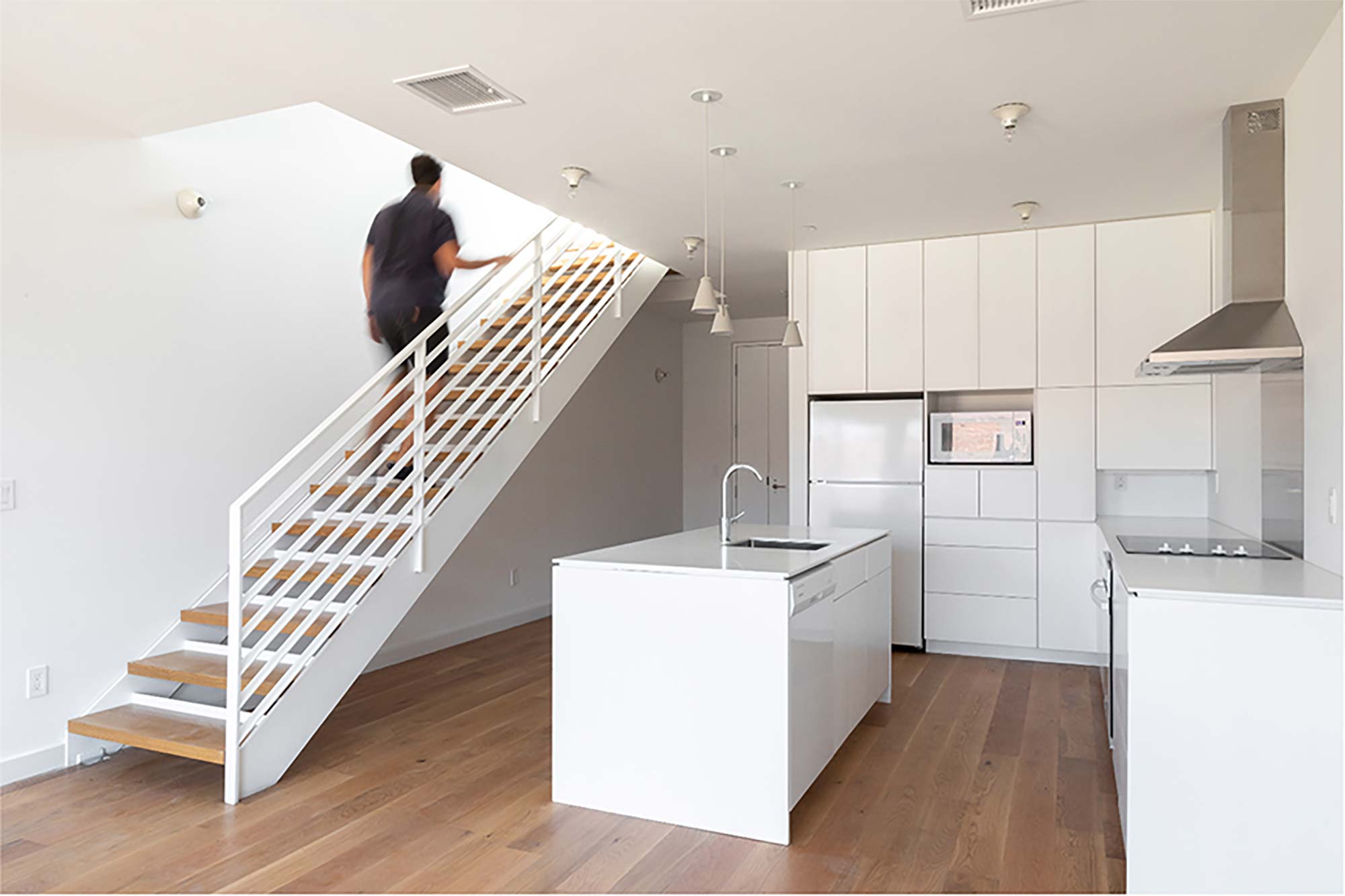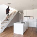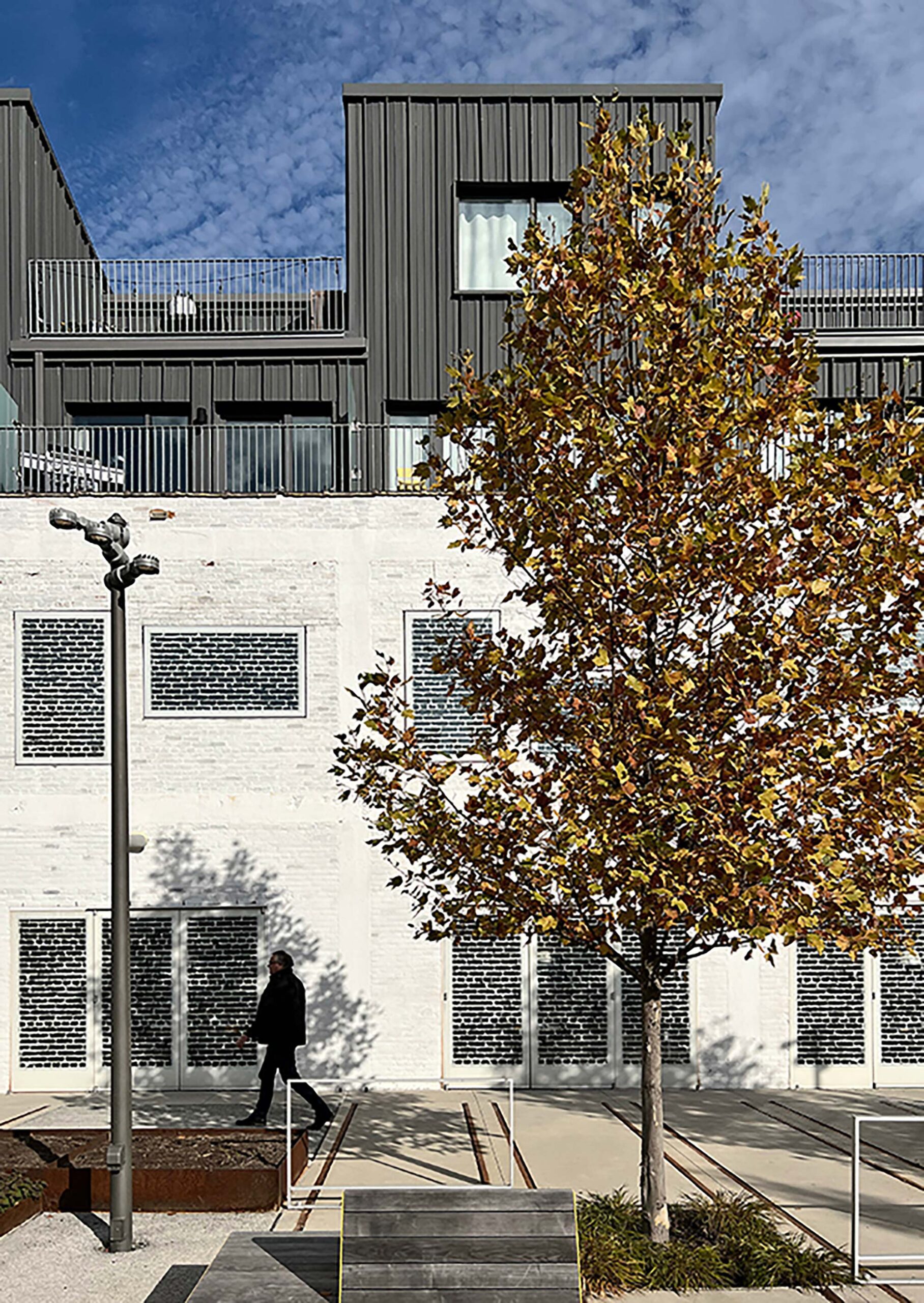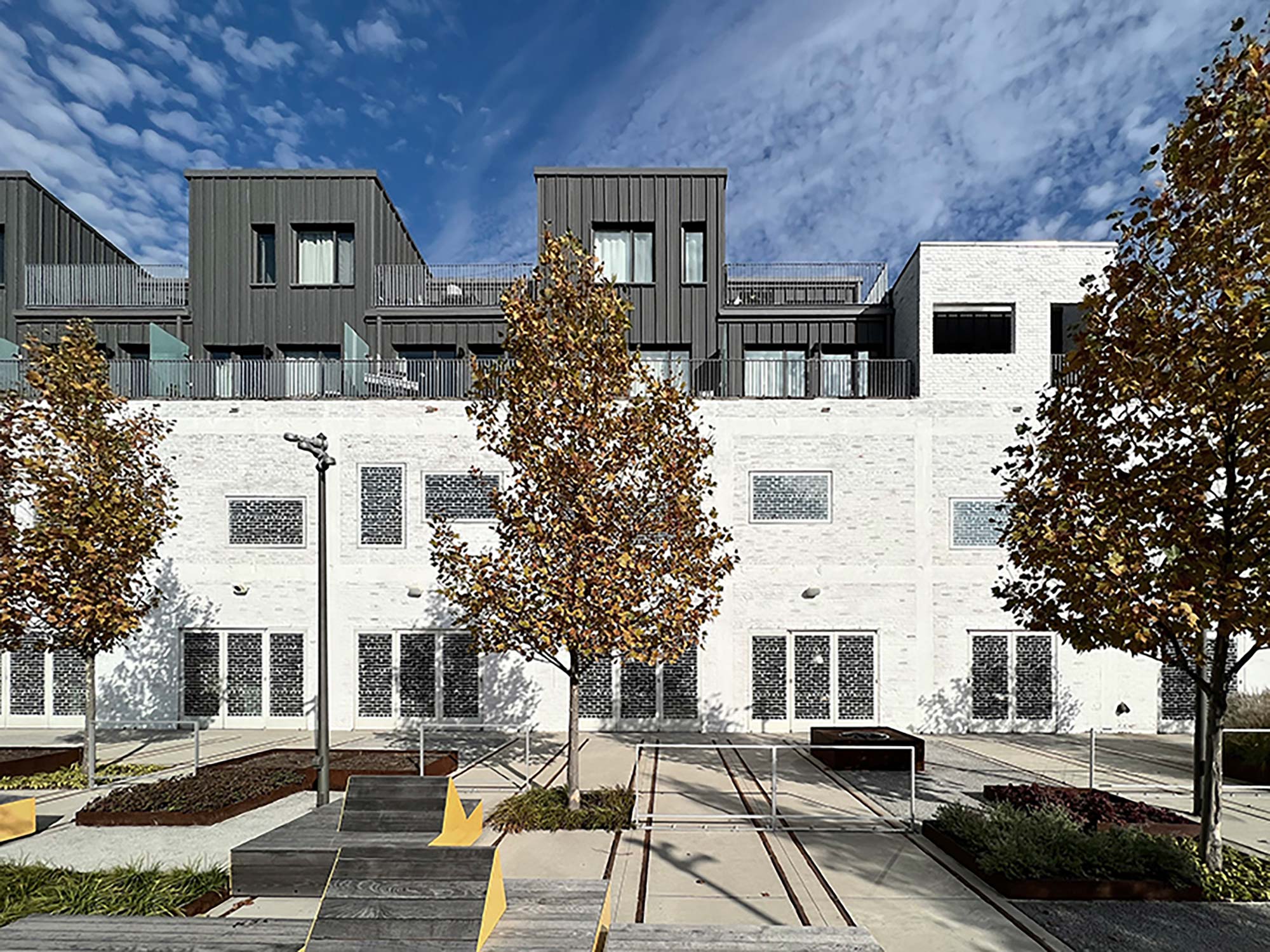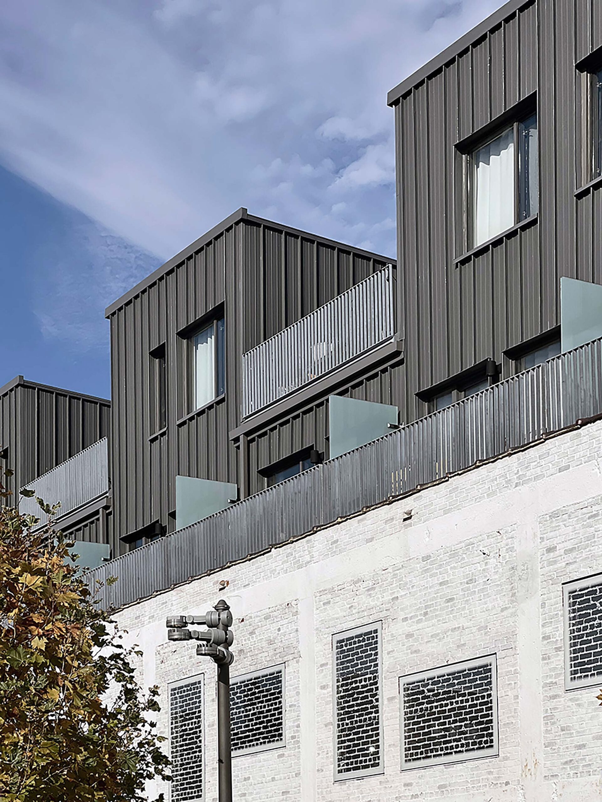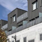 The one-bedroom maisonette units offer a small balcony on their entry level towards the courtyard, and a large private balcony on their second level, alternating each east and west. A common roof terrace on the south side is an invitation for community gatherings for the residents and office tenants.