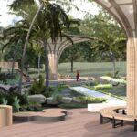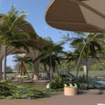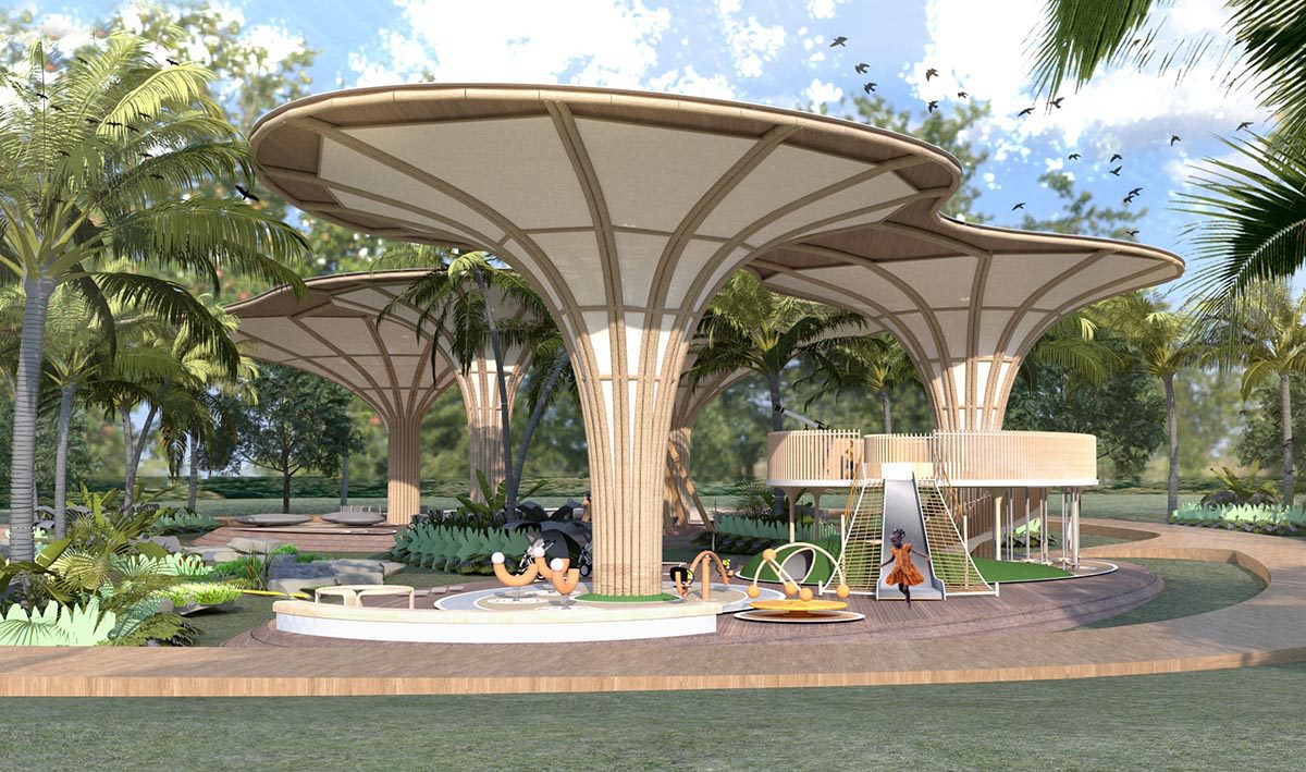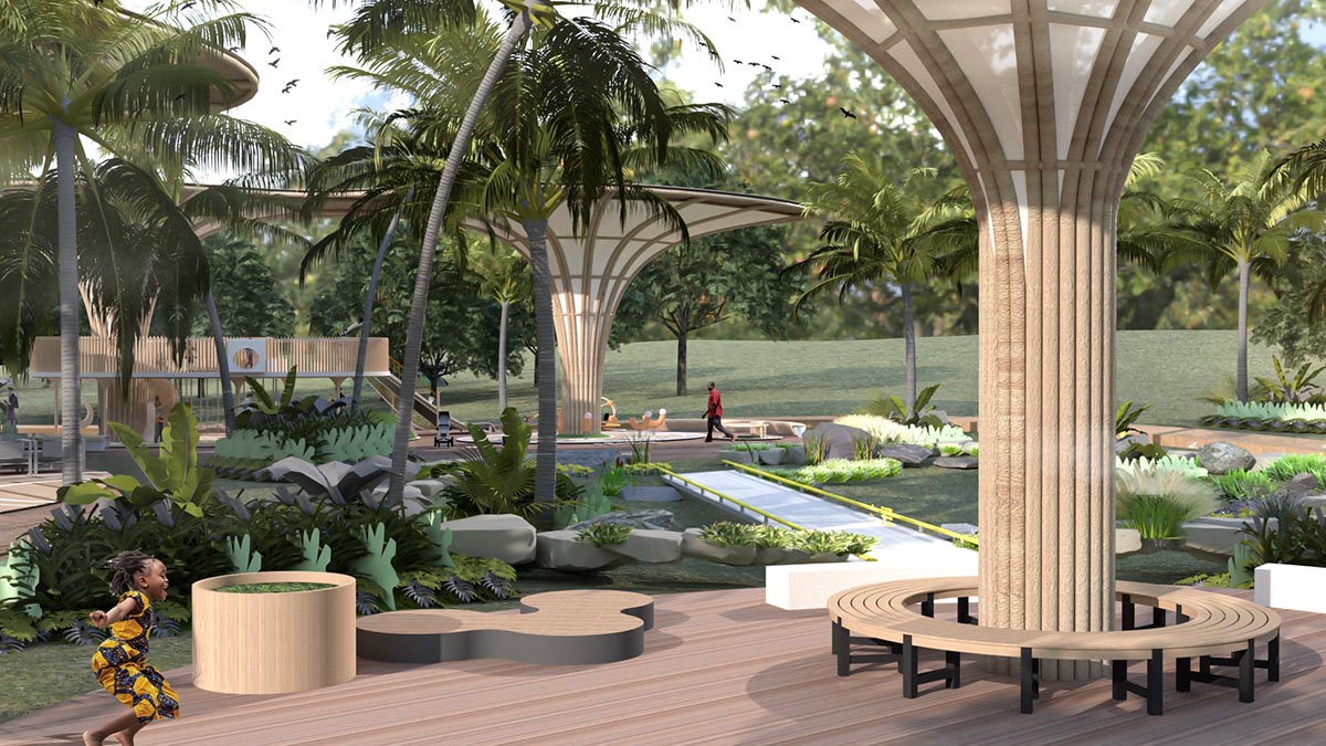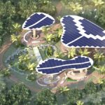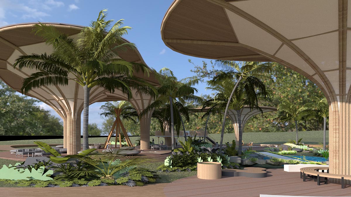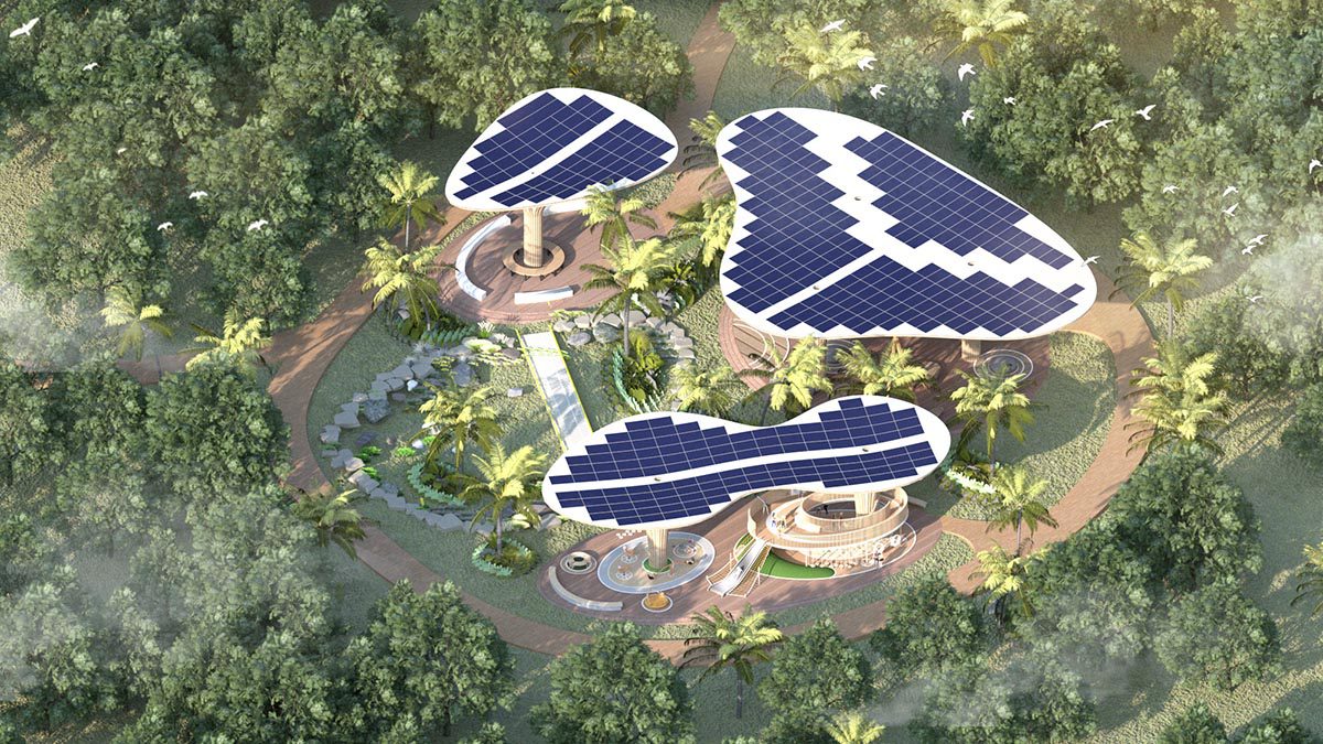This project is to develop a design scheme for an energy and water self-sufficient island in the South Pacific. A solar farm was designed to produce electricity and water demanded by the households of the island. The solar farm consists of tree-like structures capped with solar PV panels. Beneath the solar panels, a waterproofing surface will garner rainwater to the roof drain placed at the top of the trunks of each solar tree, channeling water down through vertical piping. The design concept of this solar farm was drawn inspiration from natural forms of the local biome. The structure flares outward, maximizing its surface area to collect solar energy and rainwater. It then tapers into a thick, sturdy trunk that not only supports the canopy but also functions as a channel for directing rainfall. The solar farm will also serve as a sun-shaded and rain-protected community gathering space.