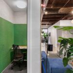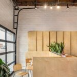Following the 2018 construction of a multi-use headquarters and showroom for the sustainably-oriented furniture startup Floyd, M1DTW was asked by the company to redesign the space. This redesign responded to Floyd’s internal growth, which necessitated the expansion of its R&D facilities to an adjacent building, and to the effects of a more hybridized workplace as a result of Covid-19. The resulting Floyd Library completely reimagines the internal dynamics of the headquarters with attention to new workplace dynamics and needs of Floyd’s staff. Designed over the course of several months, in response to thoughtful discussions about the new needs of a more remote and distributed model of work, the Library space infills the entire 3,200 SF warehouse floor plan with warmer lights, smaller meeting rooms, semi-private ‘hot desks’ for focused individual work and relaxing interiors for casual interactions. Keeping with Floyd’s values of conservation and reuse, none of the previous construction materials from Floyd HQ were demolished or discarded, and large portions of the company’s own damaged or returned furniture items were incorporated into the interior as new partitions or reimagined as wall panels to provide visual warmth and acoustical benefit.