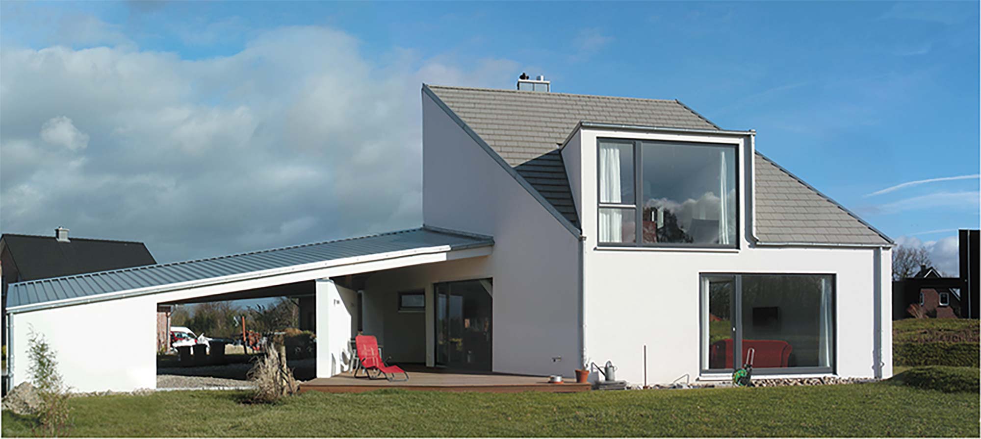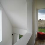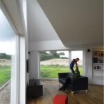 The owners’ desire to have a modern building, which is environmentally responsible as well as their intriguing site on the perimeter of a small village, led to a custom tailored house with a view into the pastoral landscape. While the design honors the traditions of North-German constructions, the modest 1,750 sq ft house was realized with a distinct identity. The angled geometry mediates between the view, the relationship of interior and exterior spaces and the proximity of neighboring buildings.
