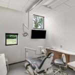 Oakridge Dental Center creates a unique and calming spatial experience for its patients and staff. Situated to preserve the large majority of a 2-acre wooded site, the stand-alone dental office encourages a spa-like experience even within its constrained project budget, and in proximity to a traffic circle. Skylights and thoughtfully placed window openings in several sizes produce a rhythmic compositional effect while ensuring all staff have access to natural light. From the exterior, a restrained material palette creates striking contrast between the building and its surrounding landscape. Norman-sized face brick with a soft-white, mineral paint finish gives the building a muted presence whereas the interior character surrenders to materiality and color. Design makes strategic use of support spaces to preserve generous qualities in publicly experienced areas. Moving around the core, one experiences portals of daylight from the perimeter, a choreographed series of framed interactions: with tree limbs, circling birds, a grassy berm, passing clouds — with not a hint of the nearby cars.