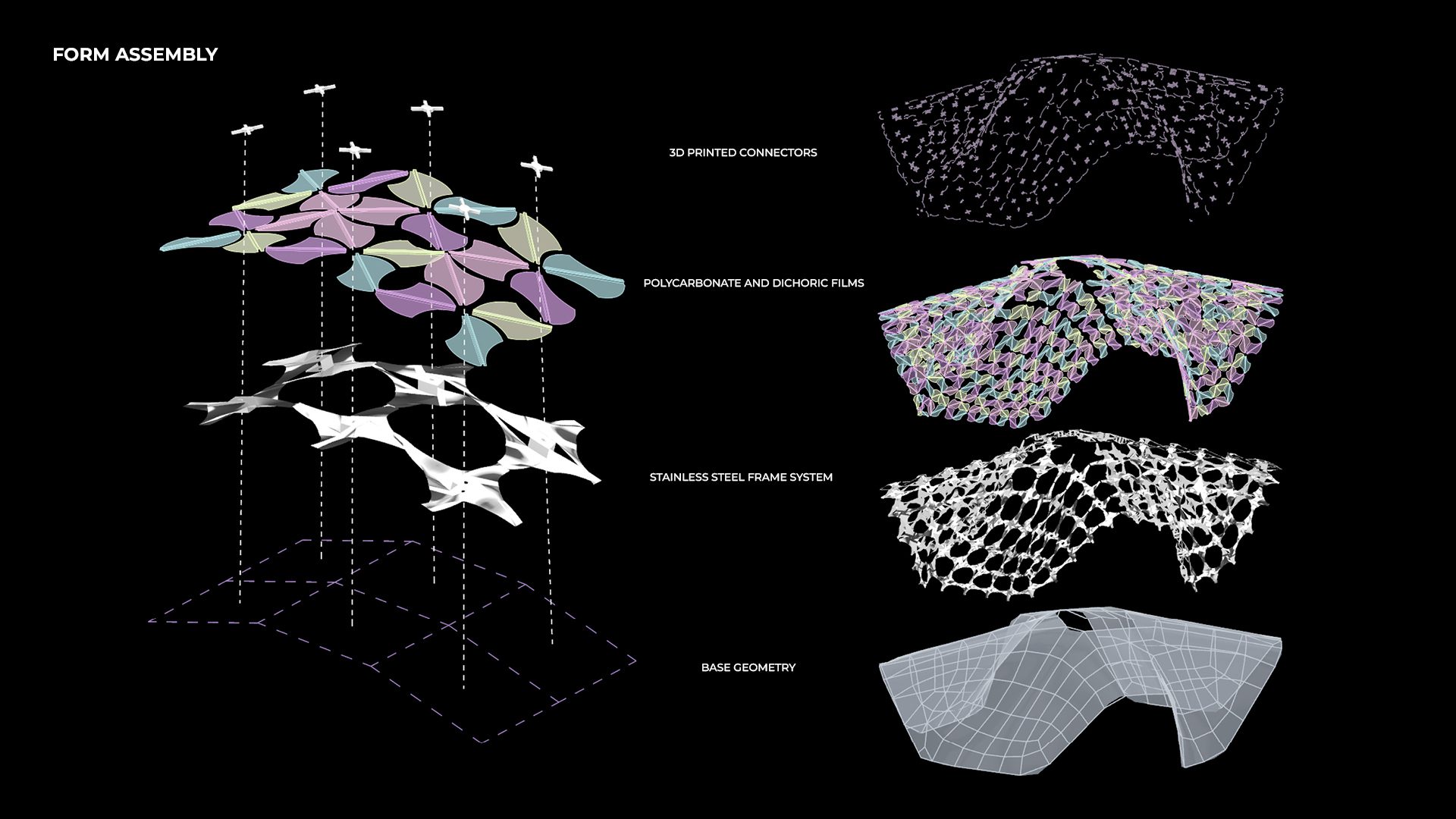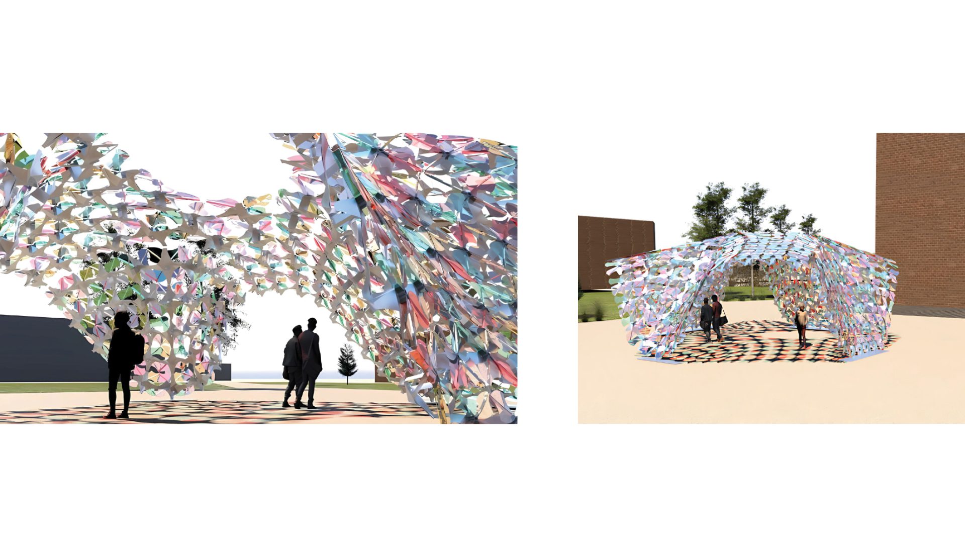 This project is a proposed interactive installation for the North Campus Diag, merging organic geometry, dynamic lighting, and digital engagement. The design features a stainless steel structural framework supporting modular curved polycarbonate fins layered with dichroic films, creating a vibrant, ever-shifting play of colors. By day, the reflective surfaces generate a mesmerizing prism effect, while at night, gradient LED lighting responds to movement through motion sensors and gesture control. QR codes enable visitors to leave a lasting digital imprint, archiving memories much like ancient petroglyphs. By blending technology with tradition, Digital Footprint reinterprets age-old methods of recording presence, transforming the…