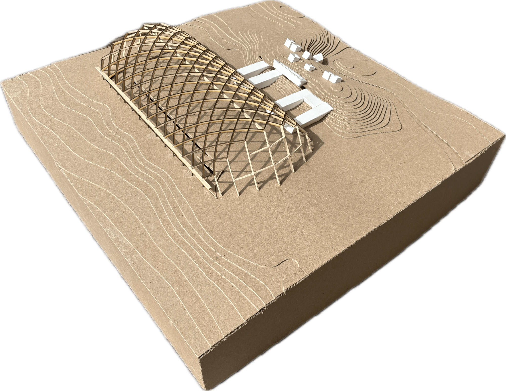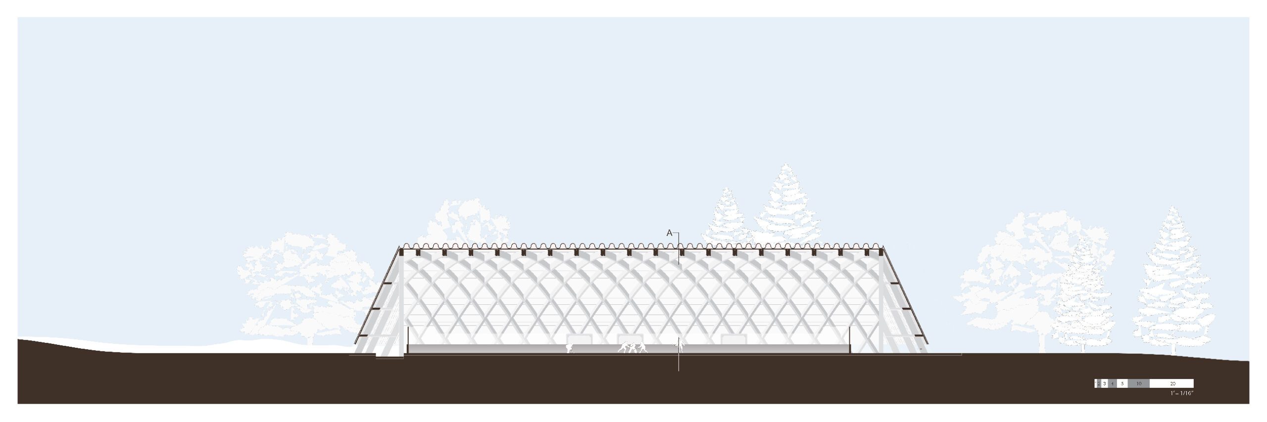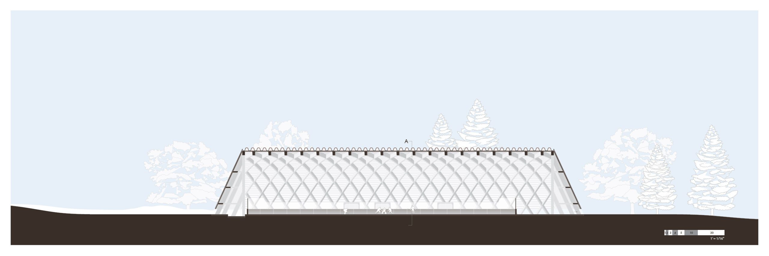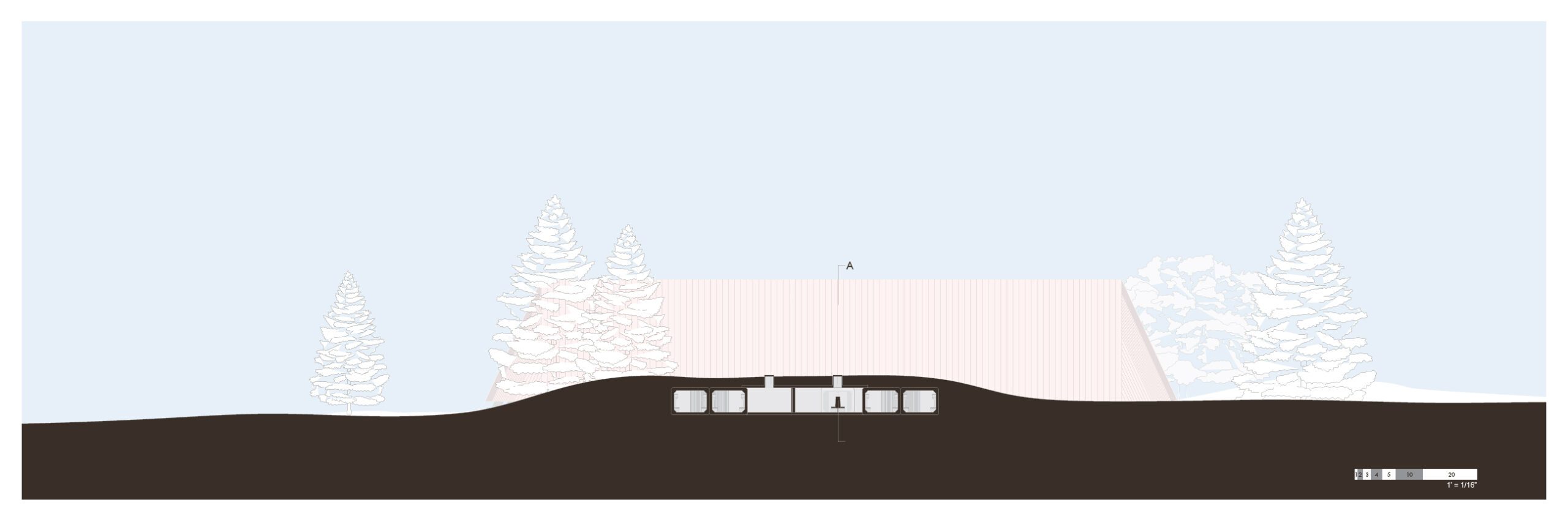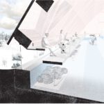 This project seeks to formally explore the drama in the progression of entering a skating rink through the emotive quality of material and relationship to a changing ground plane. Upon arrival, the patron becomes enveloped within topography; both shielding them from the noise of traffic as well as establishing a subterranean language. The next point of interaction is the accessory programming, including locker rooms and a waiting room. This space is defined by precast concrete culverts, as well as skylights that reference Le Corbusier’s light cannons in Ronchamp as a reminder that the patron is underground. Pushing into the main…