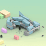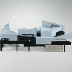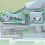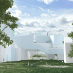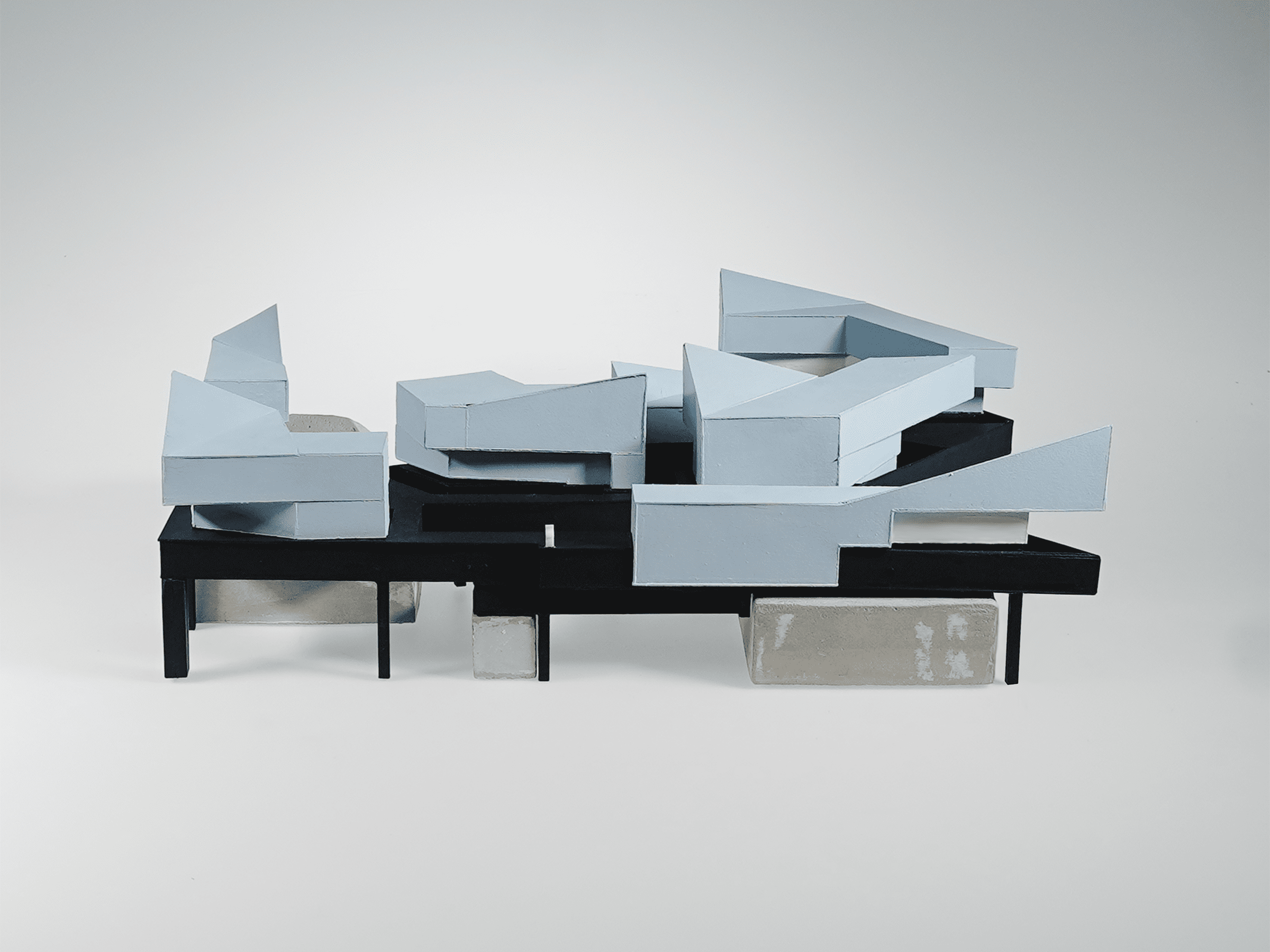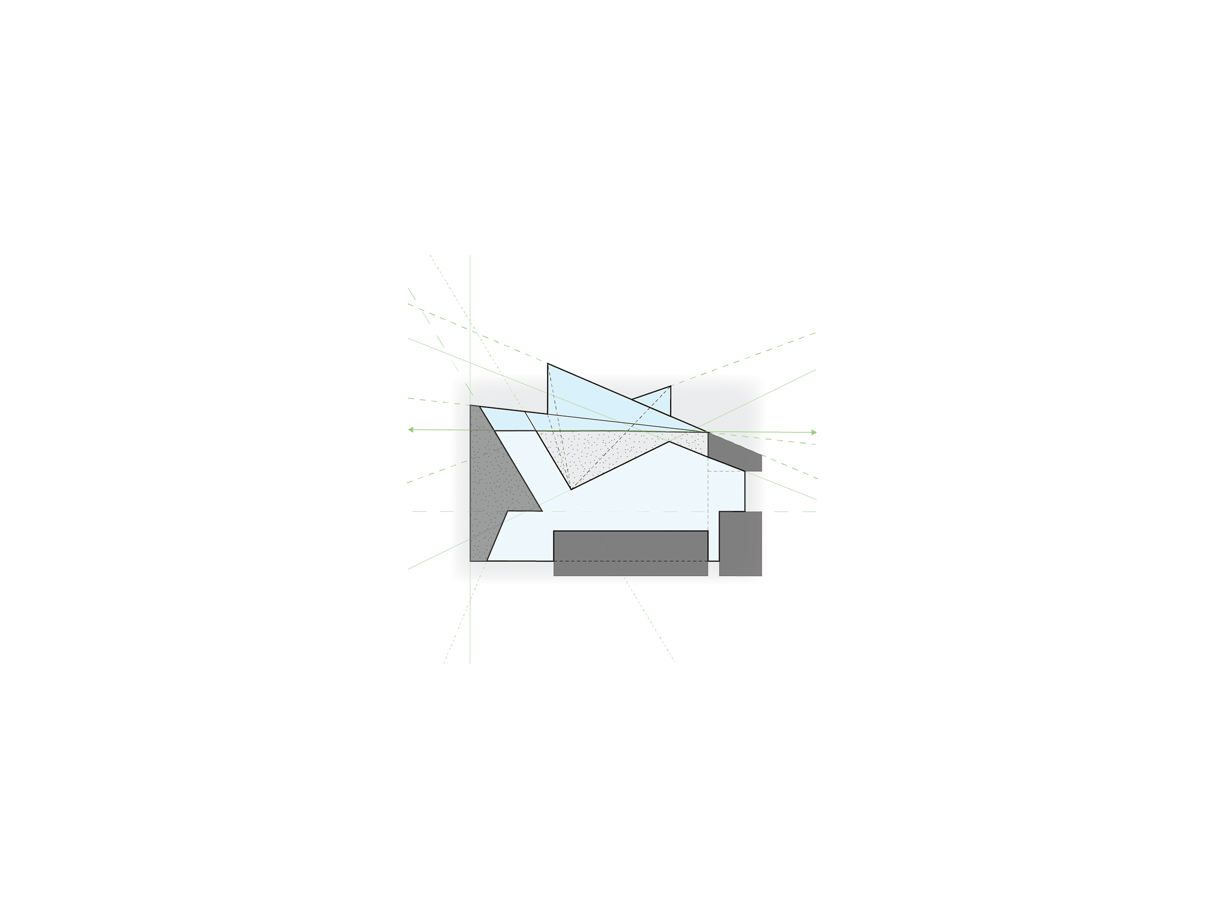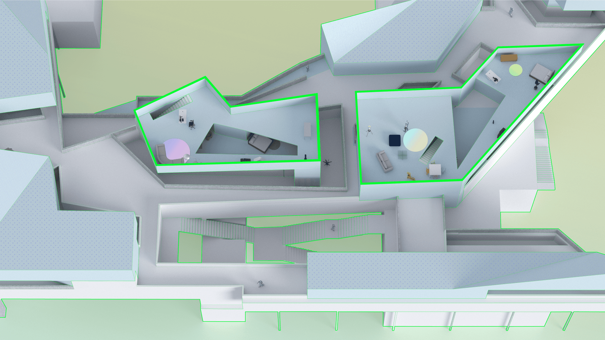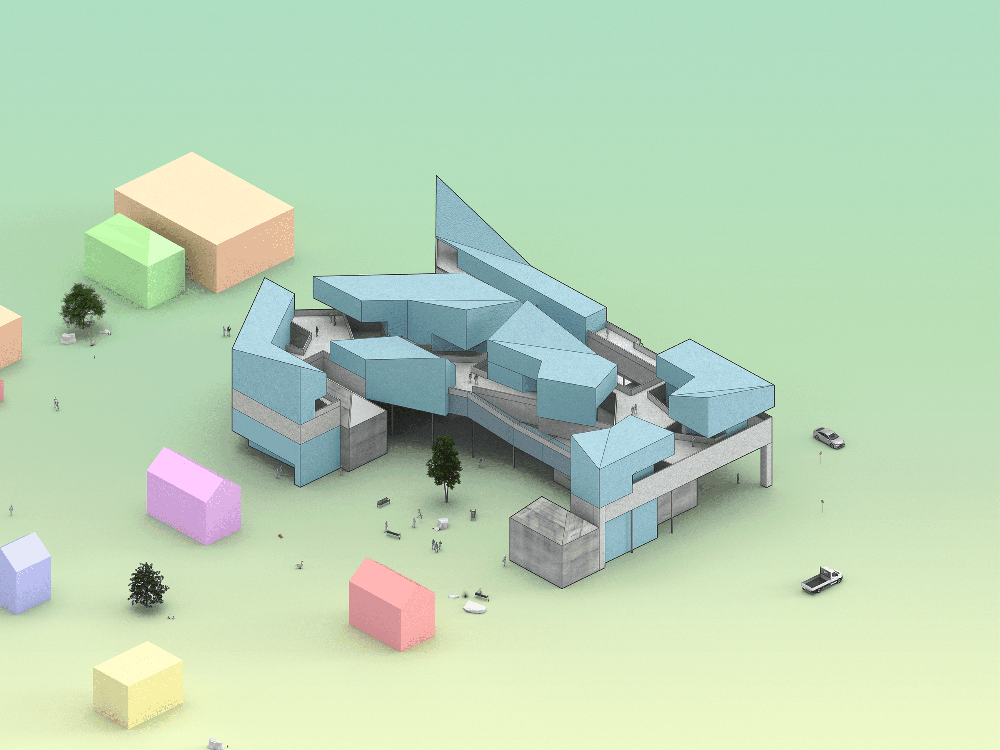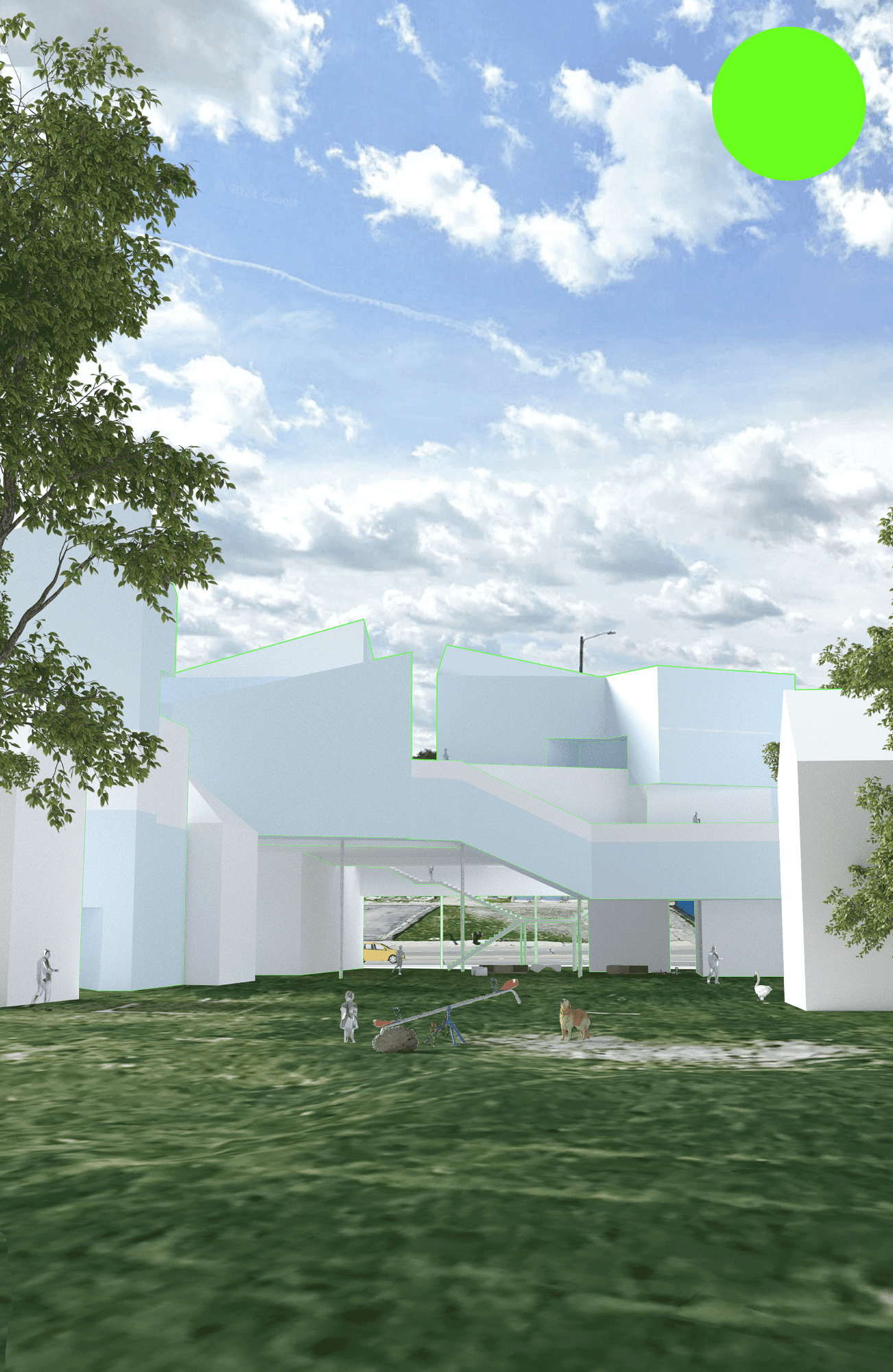 “Forms of Refuge” creates a variety of elevated and sunken sanctuary spaces that perch above and connect between the existing mixed-use residential/commercial site. The project’s early stages involved extensive form-finding and model-making exercises, resulting in the accompanying parti diagram used to guide the collective living intervention. Shared housing units are lifted above the existing structures and arranged with a spatial proximity that echoes the familiar neighborhood arrangement. These units feature overhanging pitched roofs, central stairs, and sunken patios that penetrate through a buffer zone—a lifted interior space containing shared amenities and enabling movement between units.