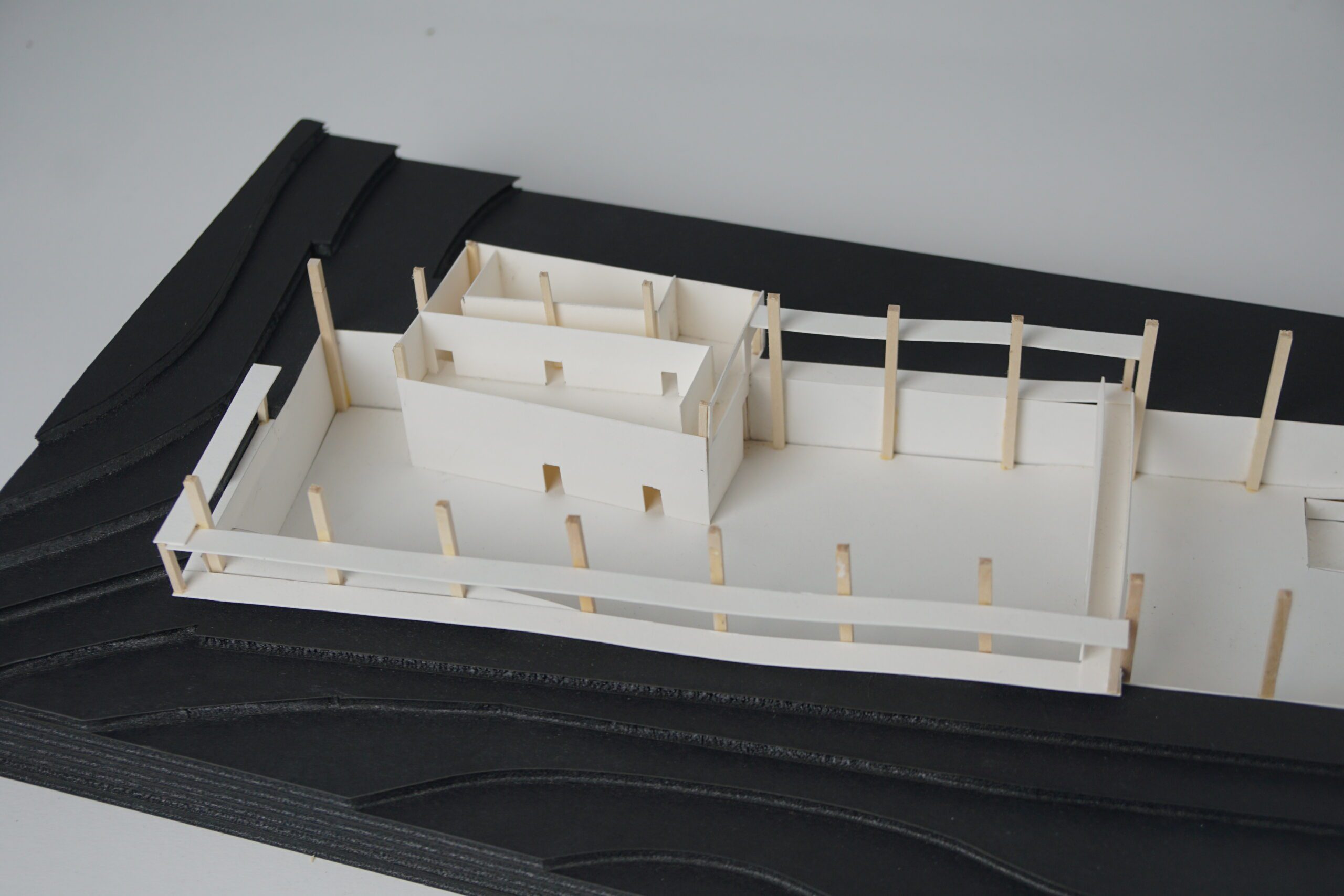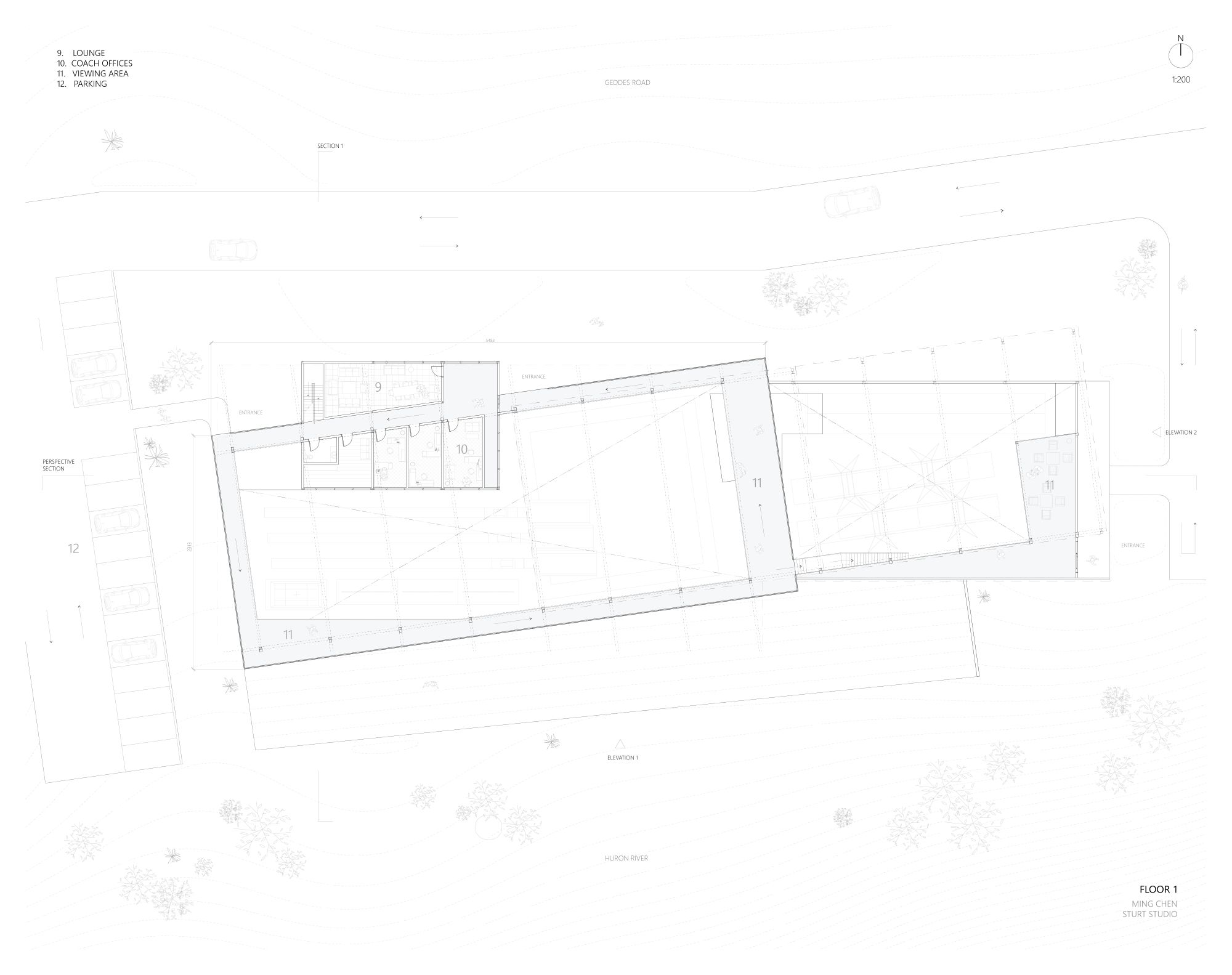 In this project, I designed a gymnastics fieldhouse for women and underage gymnasts, inspired by a visit to the Michigan Women’s Gymnastics team. Positioned facing the Huron River, the fieldhouse offers scenic views for athletes and visitors. Open areas rotate to form angled walls, serving as entrances. Elevation changes enhance the experience of the natural riverside landscape. A ring ramp encircles the practice area, allowing visitors to watch gymnasts while moving through the space. The design separates private and public functions, shaping activities to meet the needs of those entering the building.