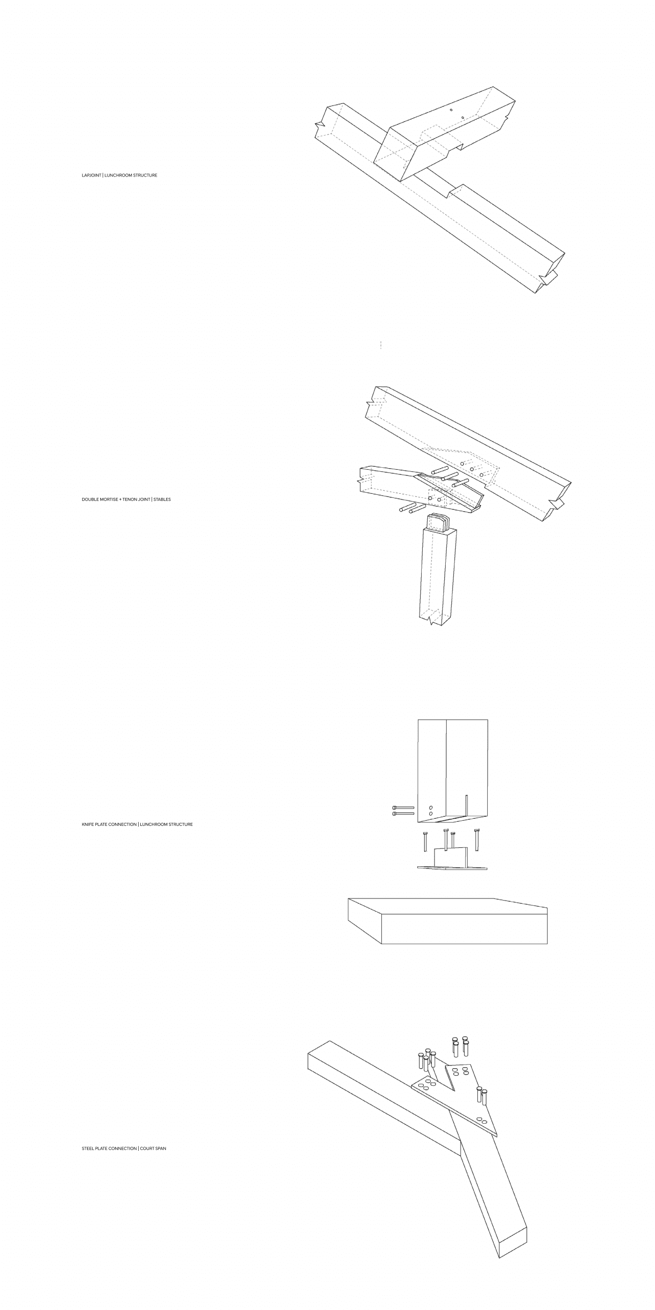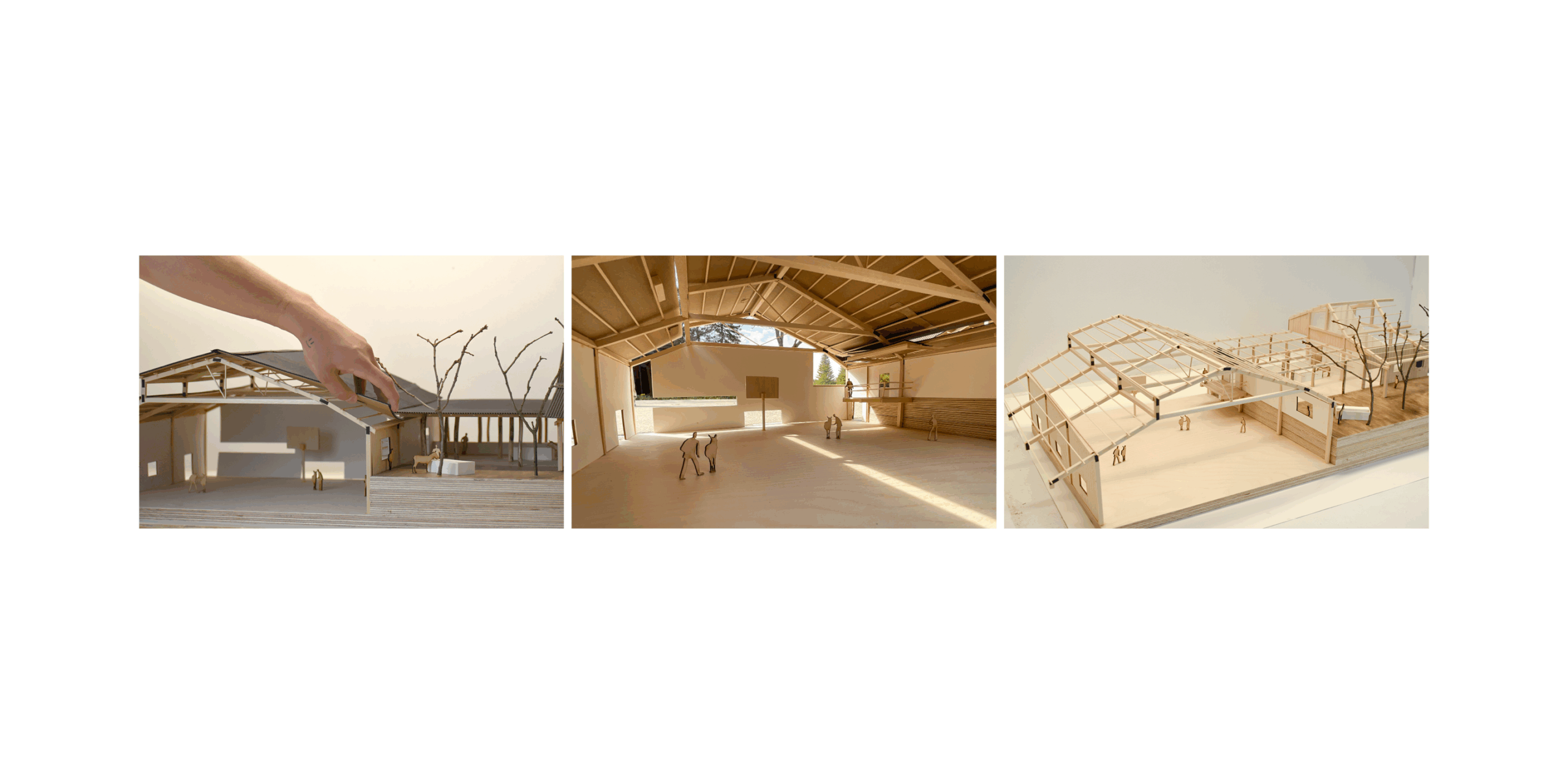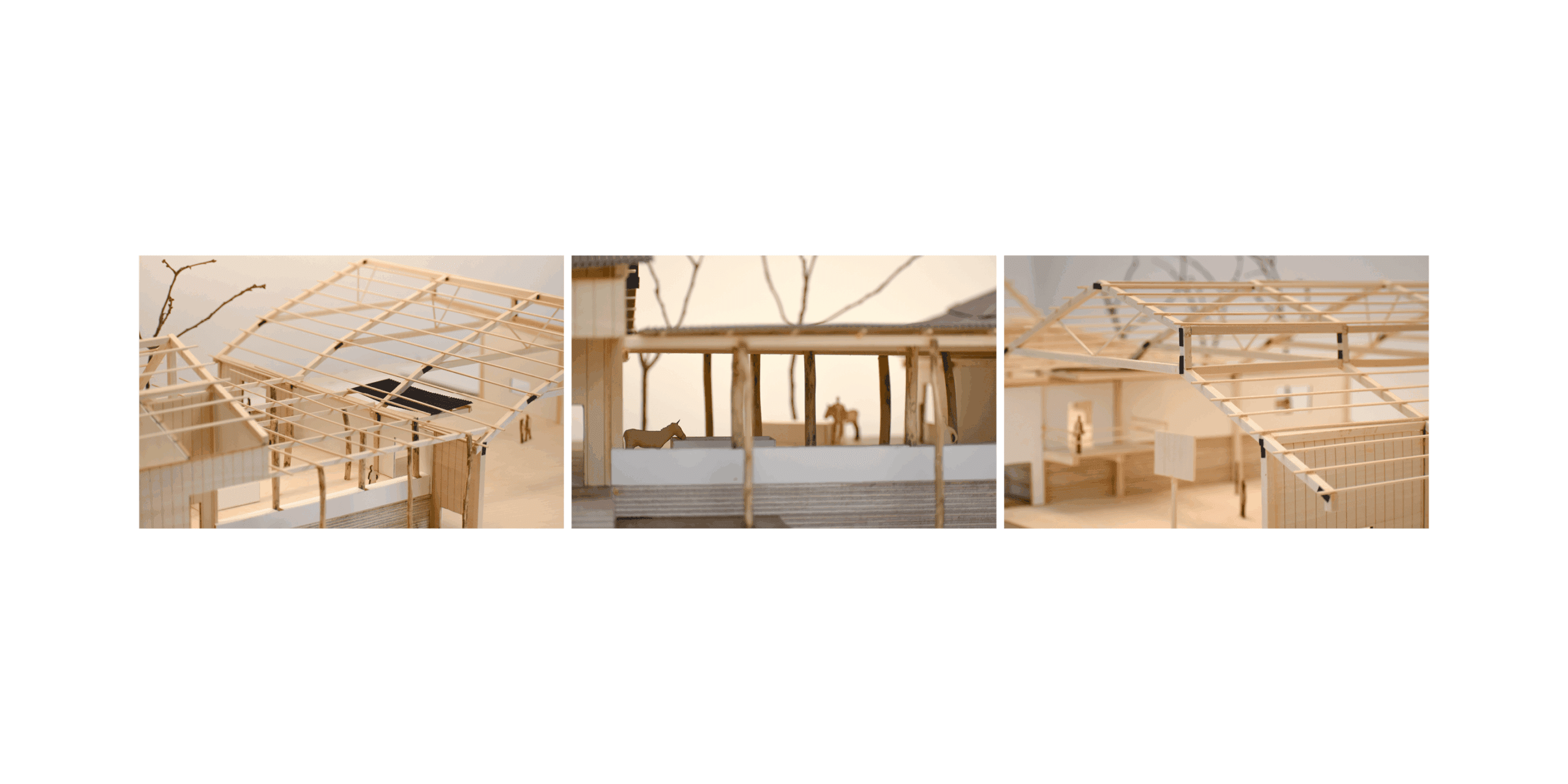 A stable is meant to contain an animal and separate it from human spaces. In this fieldhouse, the separation of spaces is minimized. Through the creation of 3 different buildings with blurred boundaries, program is designed to advocate for Burro and Human interaction. The construction of the building focused on site available materials to mitigate carbon emissions, while keeping a sense of connection between the Architecture and the land. This is done through recycling existing trees cleared from the site, to create siding and structural components. This fieldhouse focuses on creative joinery to combine natural mediums with standardized elements.