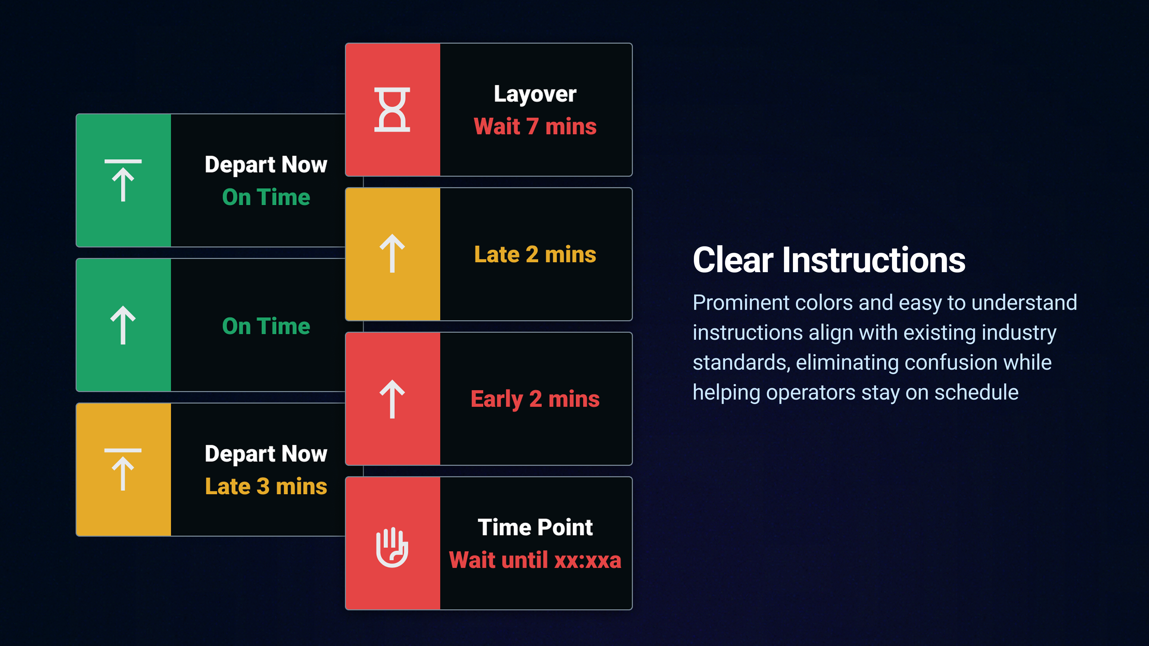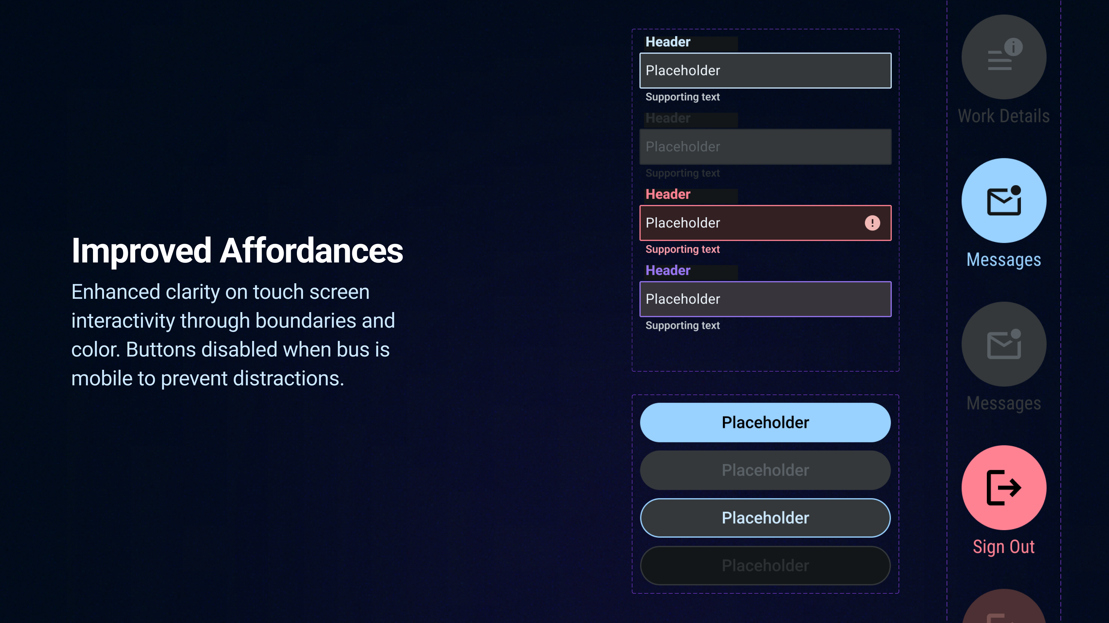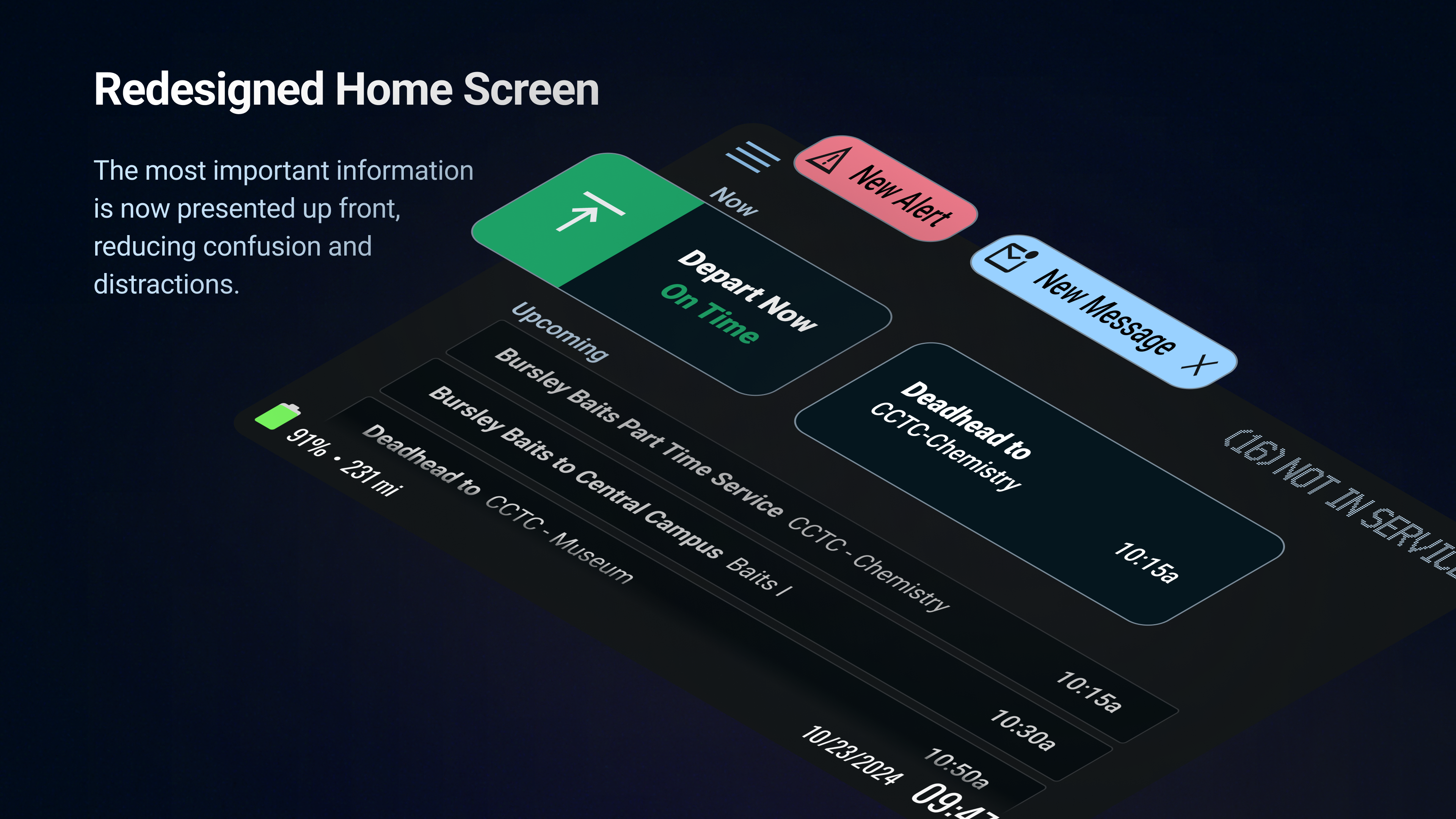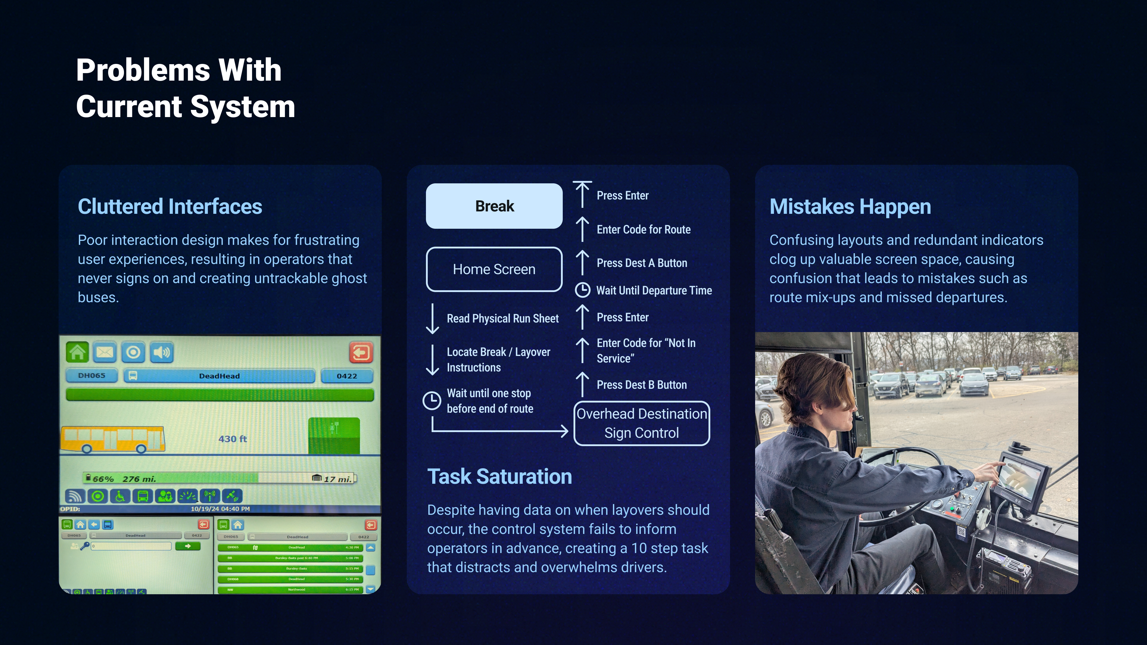 Poor interaction design in current onboard dispatching softwares creates confusion, safety hazards and frustration for bus operators. Cluttered interfaces and poorly structured information overload operators, leading to task saturation during safety-critical moments. Drivers frequently misinterpret operational instructions, causing errors that severely degrade service reliability and consistency.Pain points were identified through interviews, participant observations, and first-hand operational experiences at UM’s Transit Services. The redesigned system aligns with industry standards, reduces cognitive load by prioritizing key information based on context, and automates routine tasks—allowing drivers to focus on the road while ensuring they receive the most relevant information when needed.
