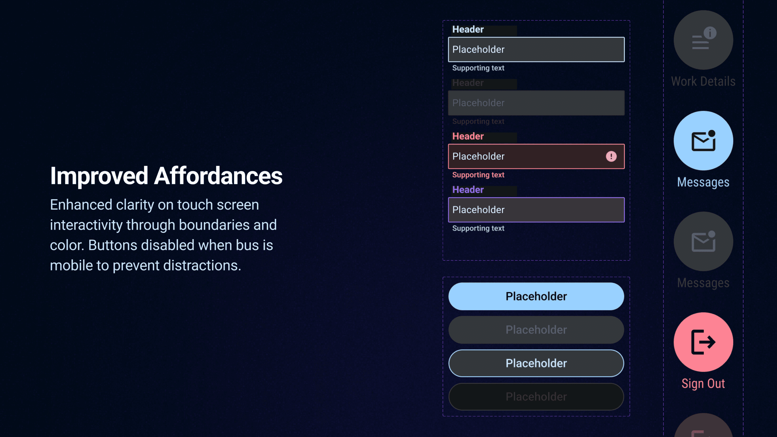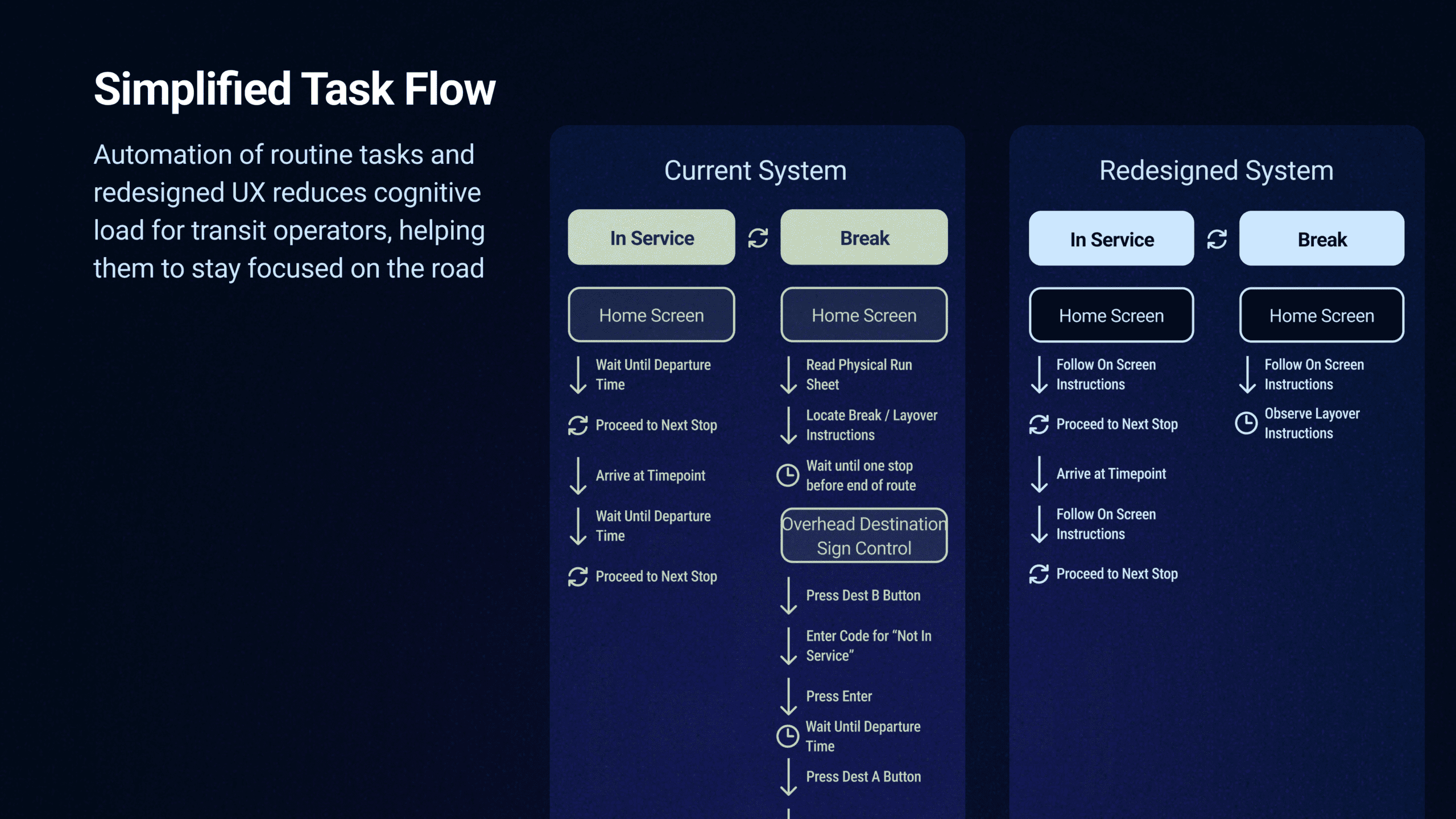Poor interaction design in current onboard dispatching softwares creates confusion, safety hazards and frustration for bus operators. Cluttered interfaces and poorly structured information overload operators, leading to task saturation during safety-critical moments. Drivers frequently misinterpret operational instructions, causing errors that severely degrade service reliability and consistency.Pain points were identified through interviews, participant observations, and first-hand operational experiences at UM’s Transit Services. The redesigned system aligns with industry standards, reduces cognitive load by prioritizing key information based on context, and automates routine tasks—allowing drivers to focus on the road while ensuring they receive the most relevant information when needed.