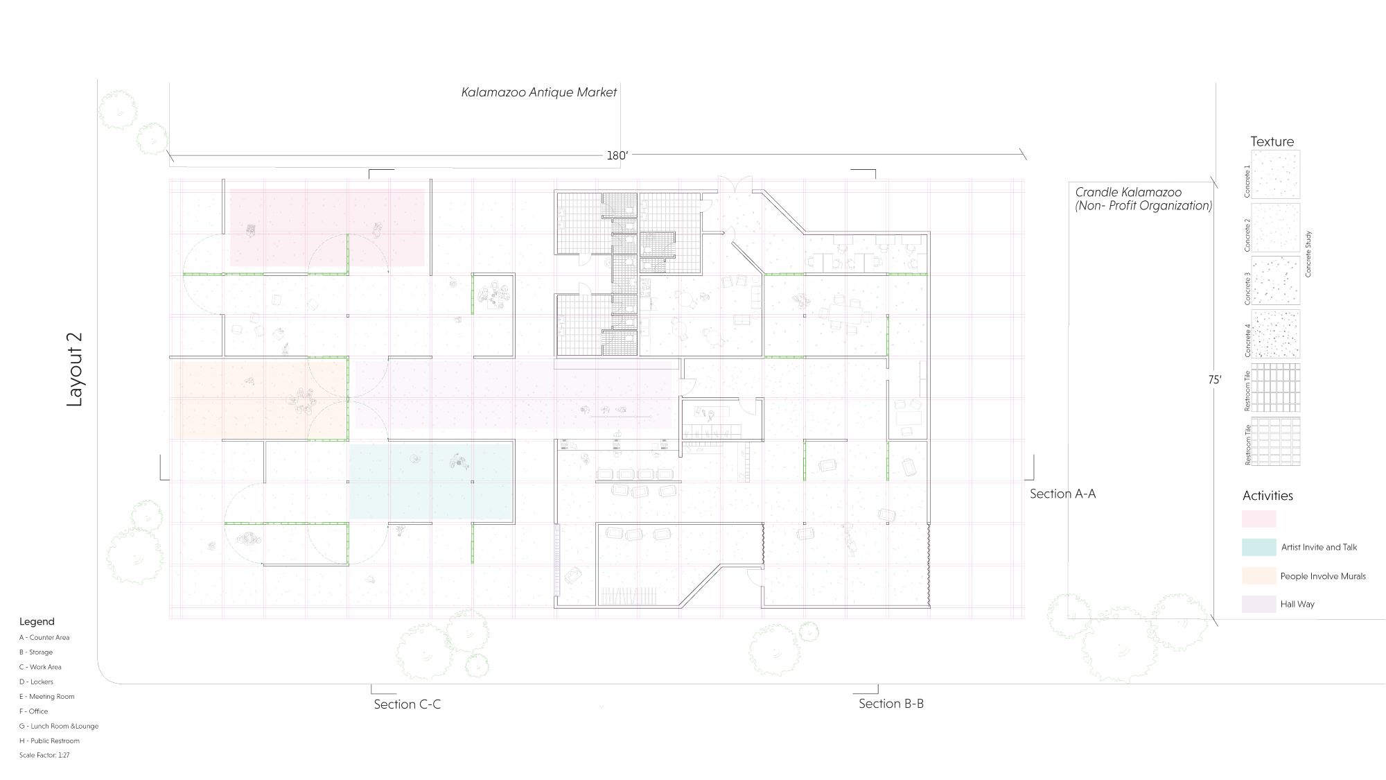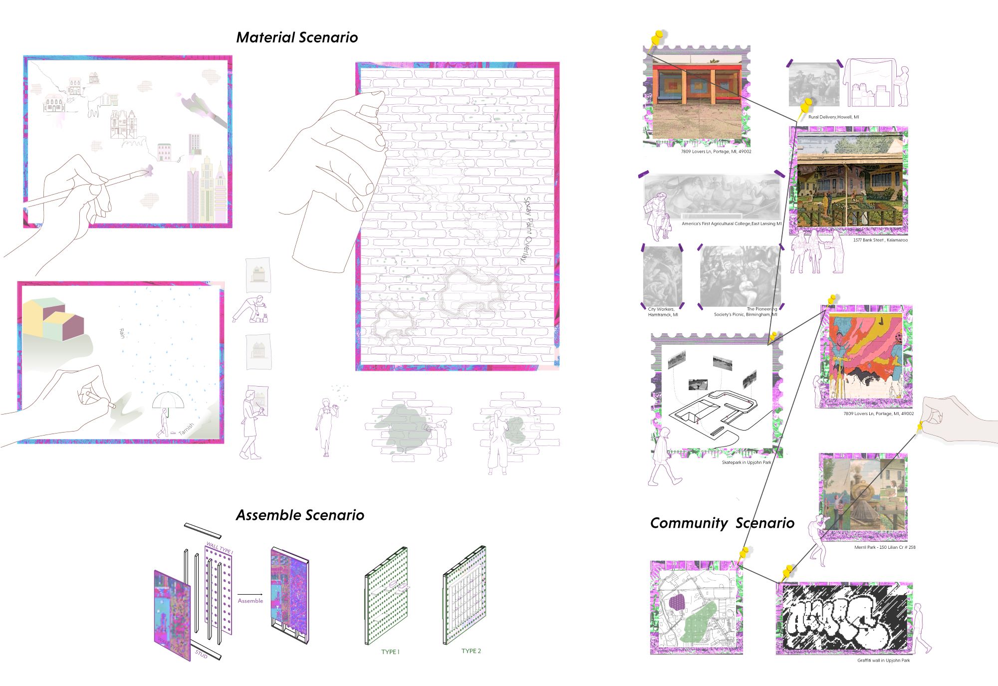 Revitalizing postal spaces, the design integrates pop-up post offices and a hub building to enhance accessibility and engagement. Inspired by Kalamazoo’s mural history and the WPA program, it merges art and function to foster community interaction. Rotating walls enable flexible layouts, support local businesses, and provide a platform for artists. The hybrid HUB design connects indoor and outdoor spaces, while mobile pop-ups adapt throughout the day. Using murals as storytelling tools, the project strengthens community ties, promoting activism and shared narratives. Reimagining the post office, it becomes a dynamic, interactive hub beyond its traditional role.