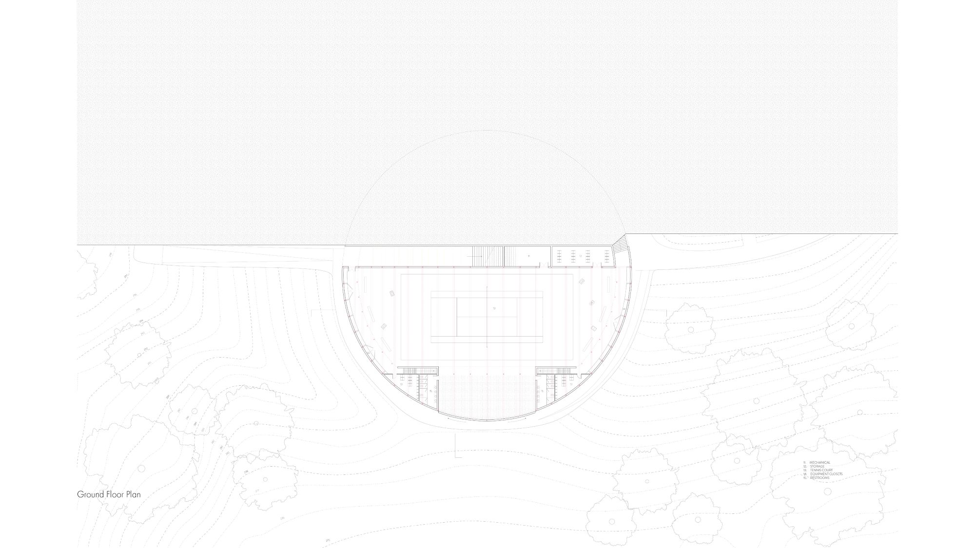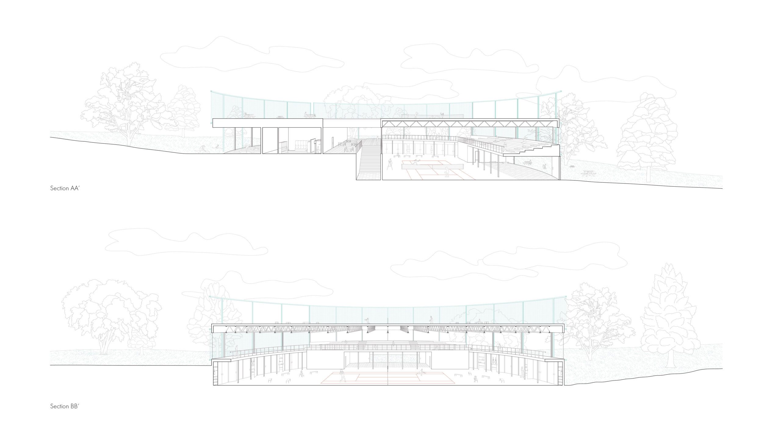 At the heart of this fieldhouse is the concept of the “interface”- a defining element that both separates and unites. Drawing inspiration from the tennis court, where a simple net delineates competing grounds yet facilitates a lively back-and-forth, this project delves into how interfaces can be more than just dividers but dynamic mediums, pivotal in facilitating the interplay and exchange between two distinct realms. A linear walkway splits the form into two main volumes: the animated “field” and the restorative “house”. And it is through interfaces that spaces find their meanings – not as isolated fragments but as a cohesive…