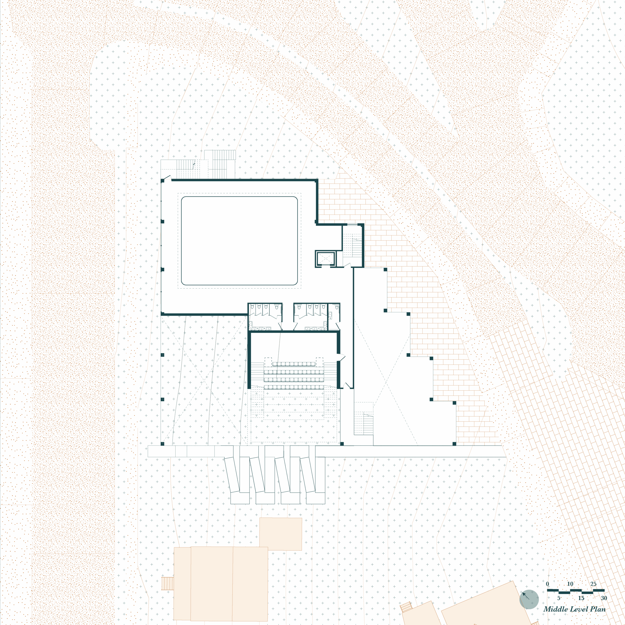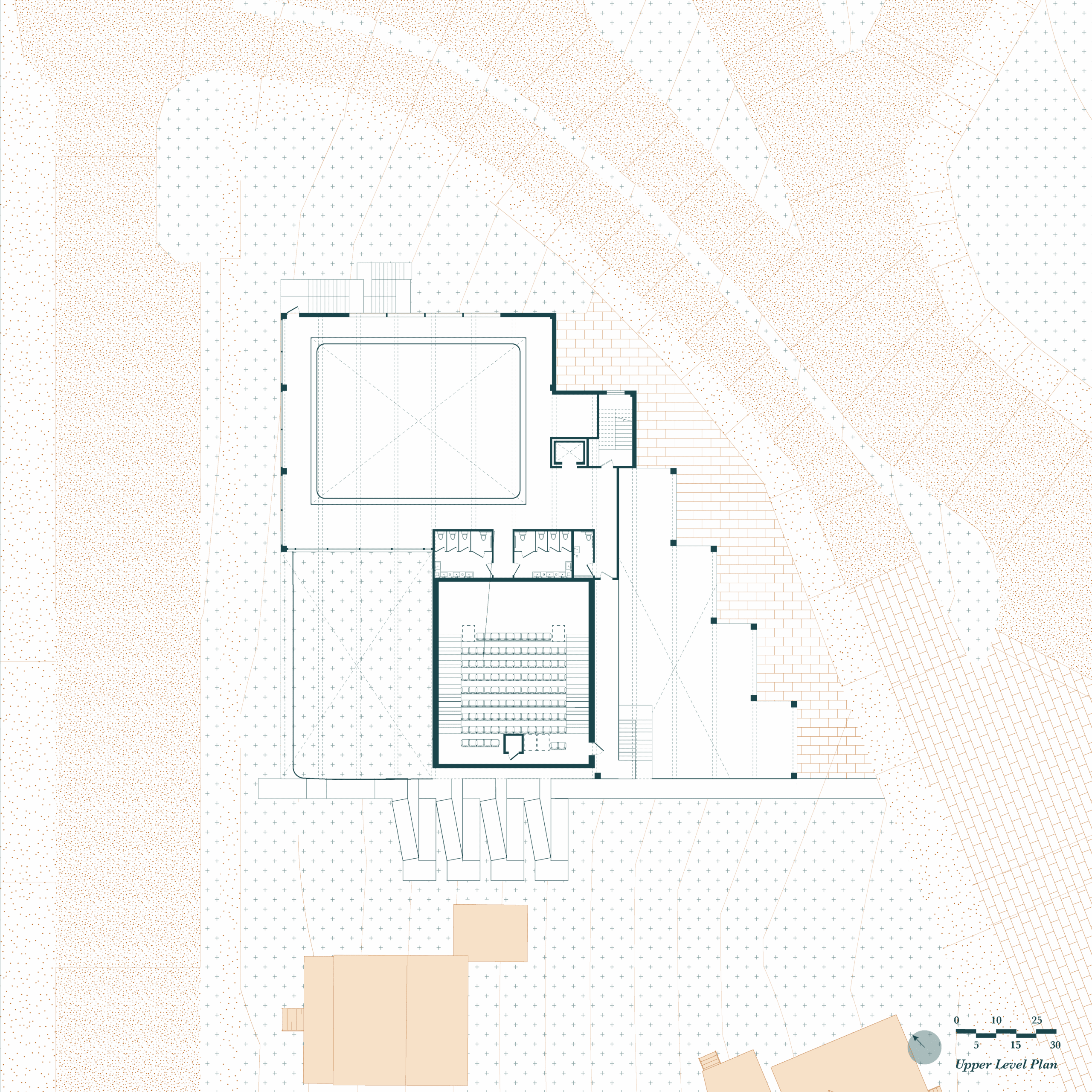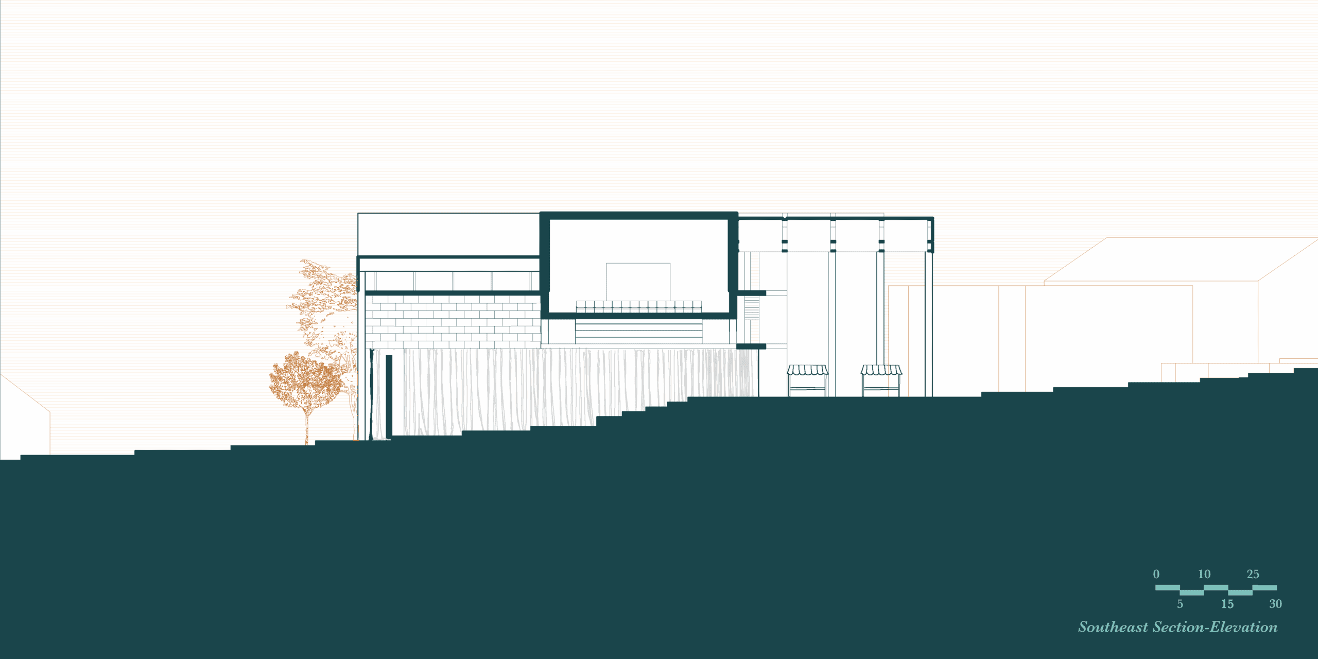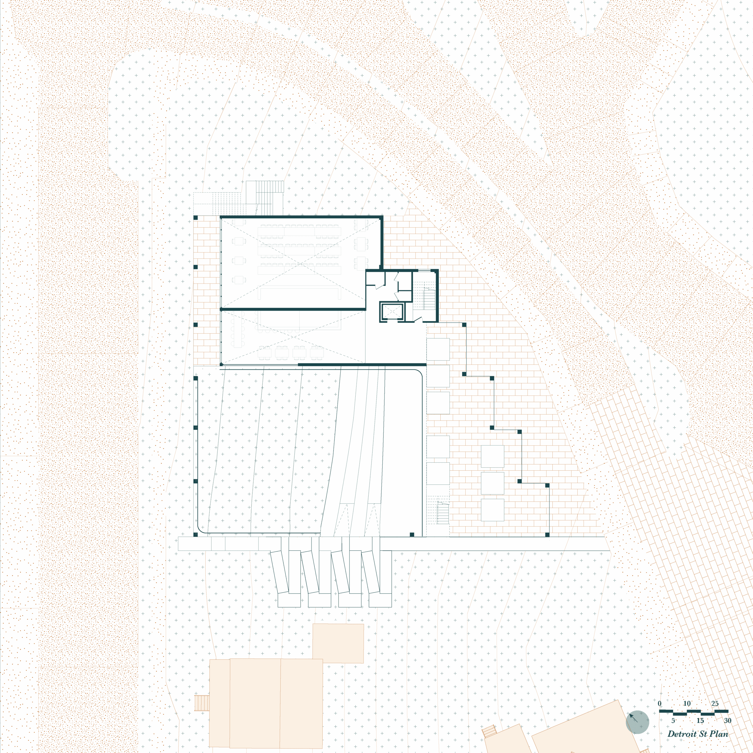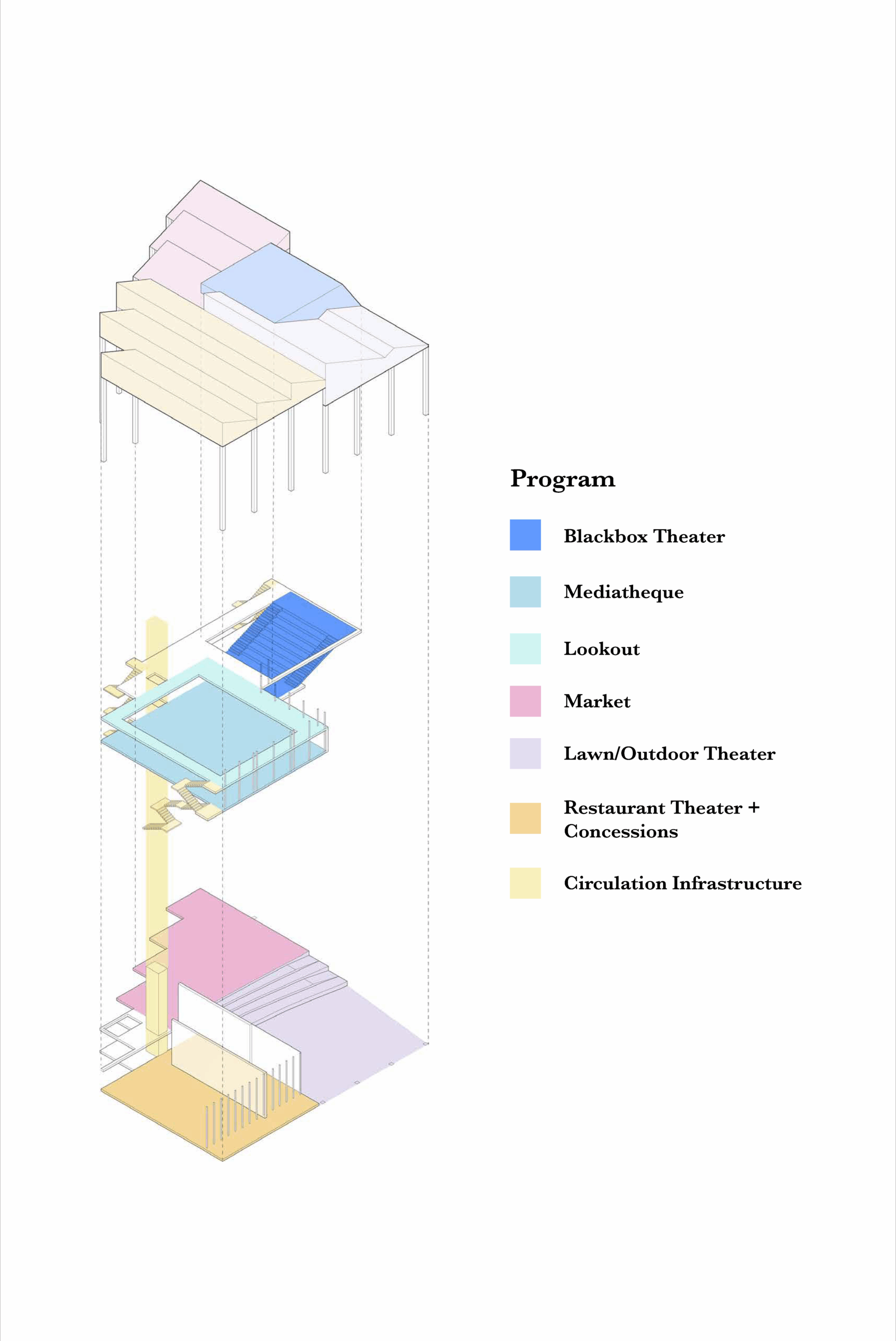 Inspired by the Kerrytown Farmers Market a mere six-minute walk away, this theater explores the possibility of thinking through the filmgoing experience as a market. By weaving enclosed and outdoor spaces, this theater looks to provide flexible spaces—partitioned by dropping curtains—while also contributing much needed public space for lingering in the neighbourhood that is open all day. An outdoor public theater, a classic blackbox, a ‘restaurant theater’ for the performance of food-making, and an experimental theater space come together under one shed structure, complete with a ‘market’ space acting as an extension to the one up the street.