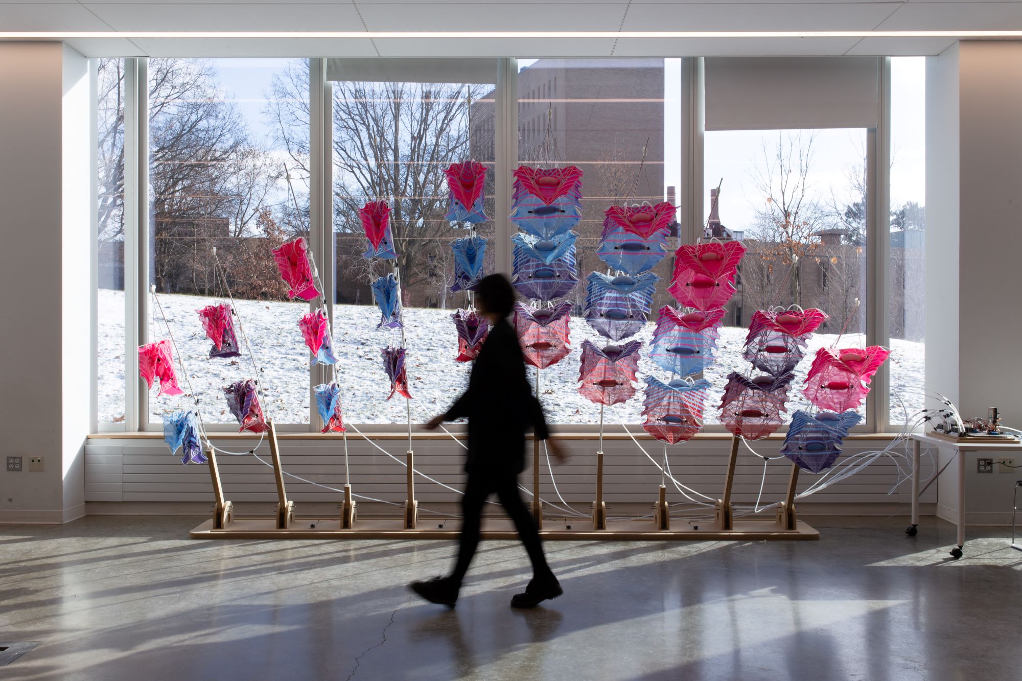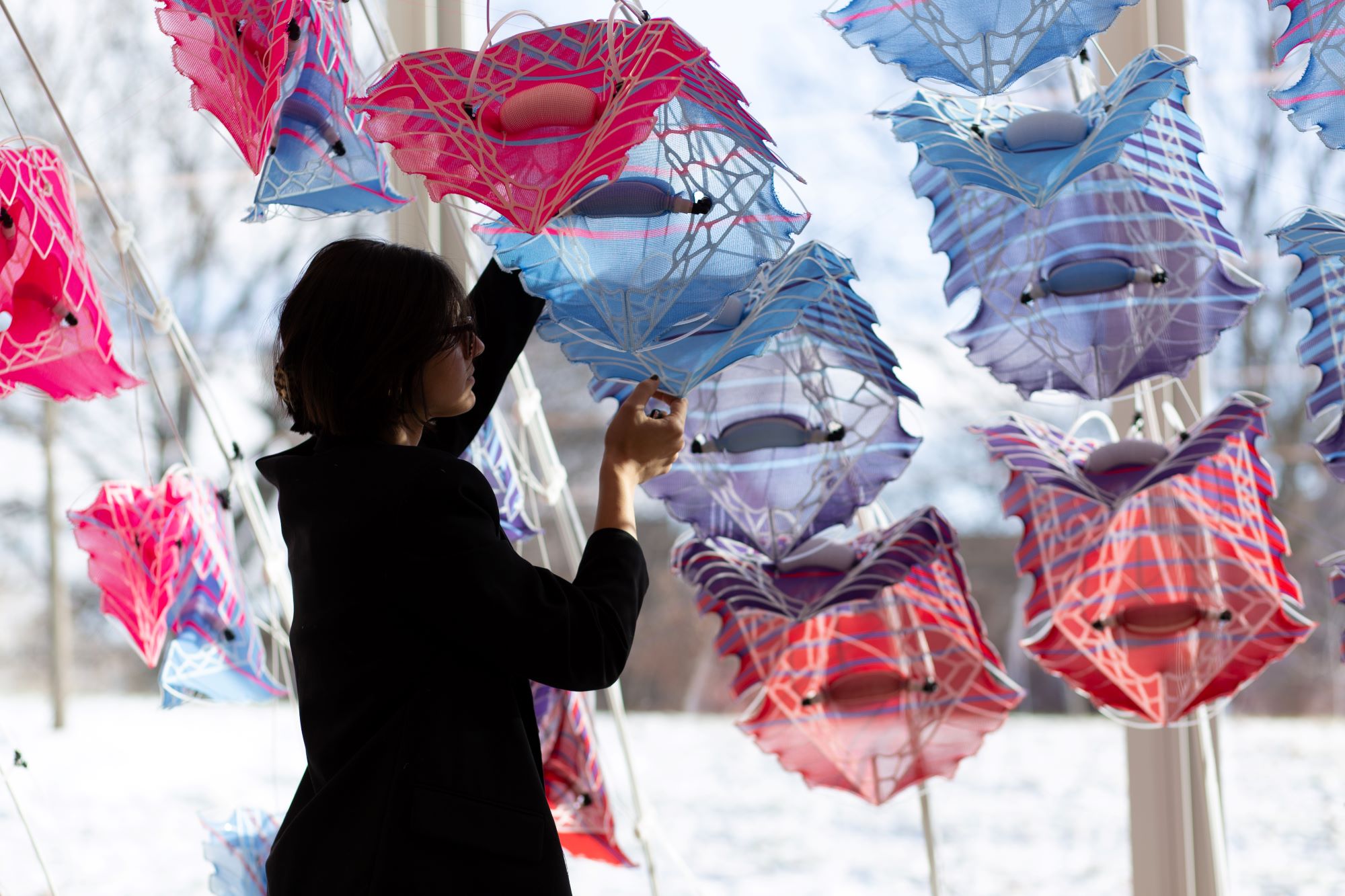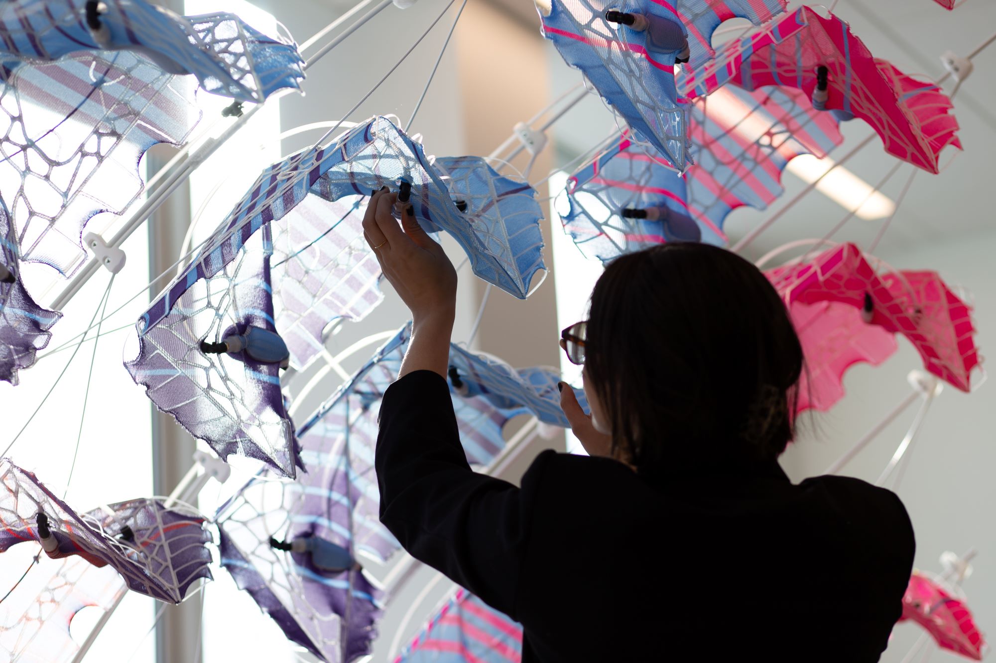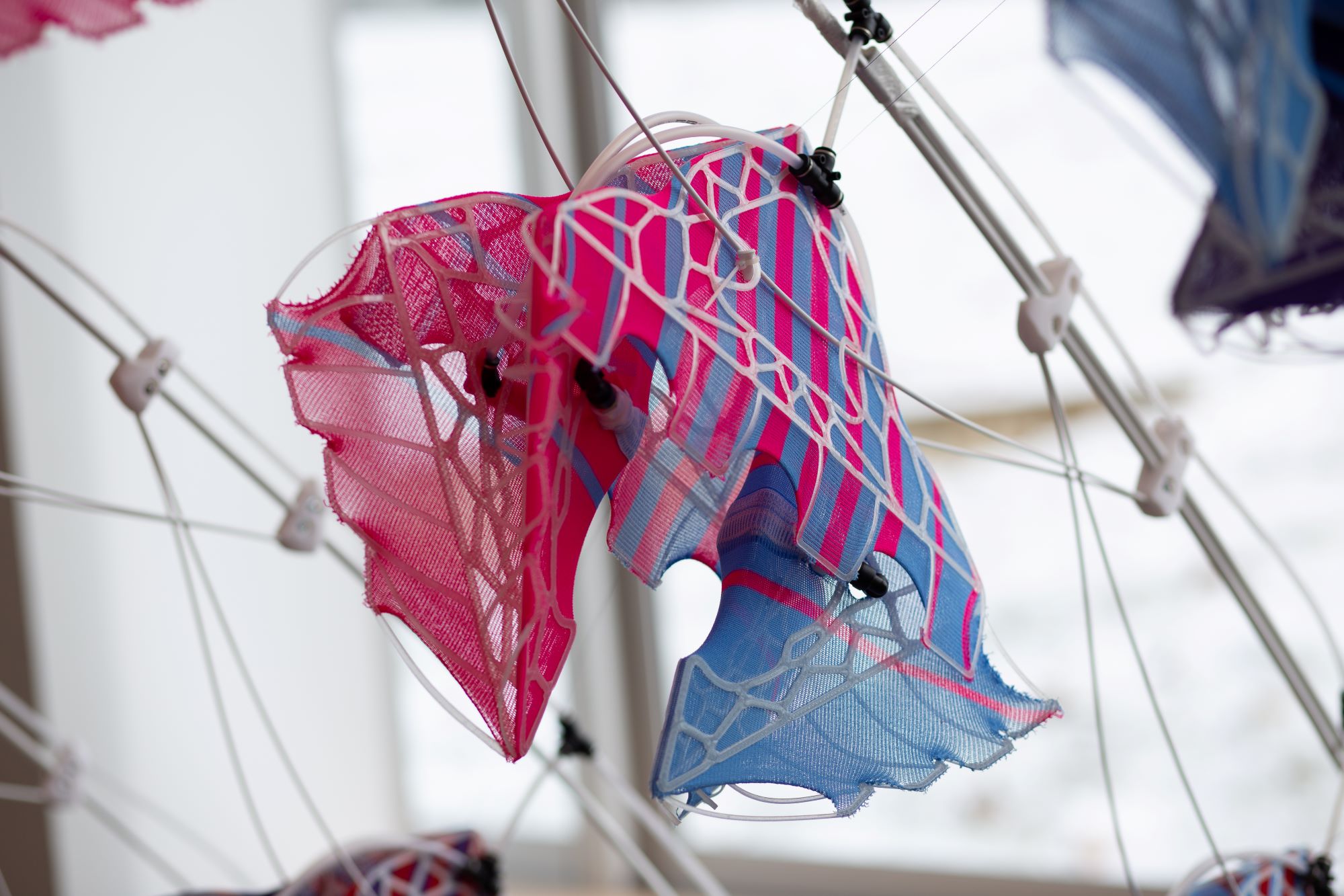This research project explores the integration of air-driven thermoplastic textile composites (TTCs) to create dynamic, sensorial spaces inspired by natural systems. The project draws from biomimicry, particularly the responsive behavior of the Mimosa pudica plant, the soothing sounds of a bamboo forest, and the lightweight structures of insect wings. By combining CNC knitting, 3D printing, and pneumatic actuation, the project creates a system capable of responsive, kinetic behavior with a focus on ambient sound and lightweight form. Through a series of material experiments and design iterations, the project advances the development of TTCs, addressing challenges like consistent adhesion, dynamic porosity,…