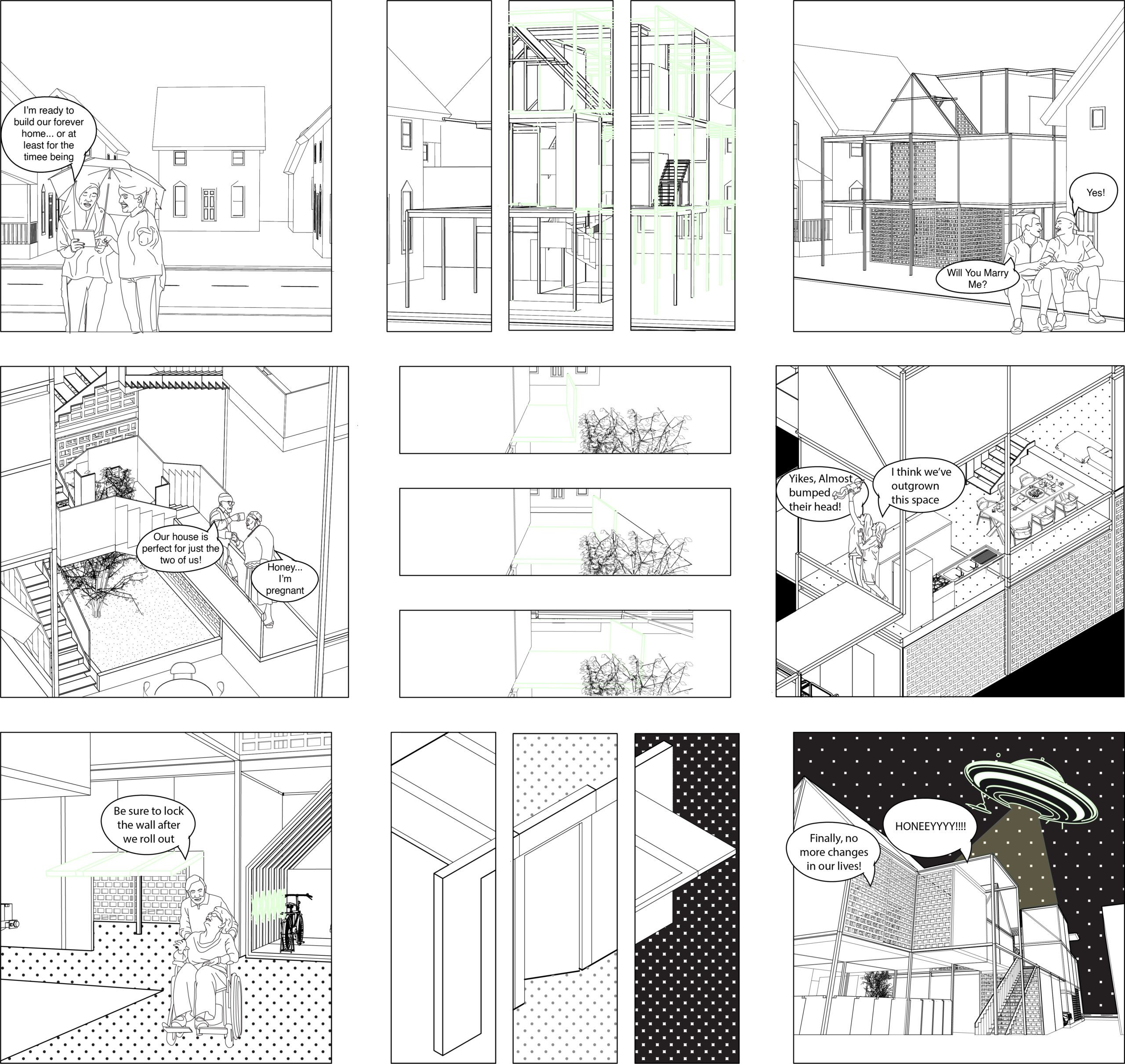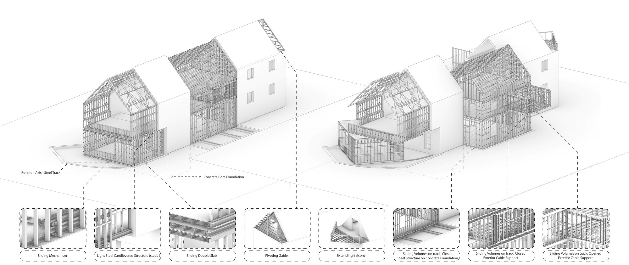 Pocket House reimagines the forms of collective living through modular designs that expand and retract through mechanical automations that transform spaces to accommodate changes in family size, seasons, rental types, and other unexpected changes.