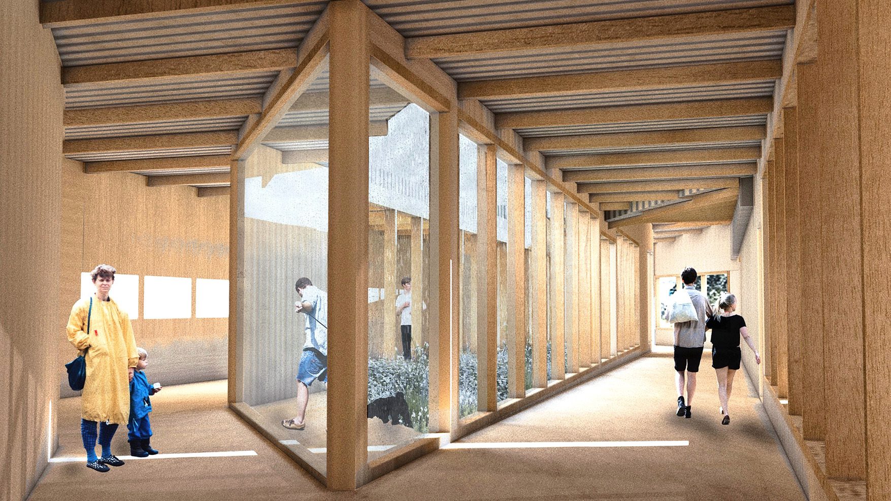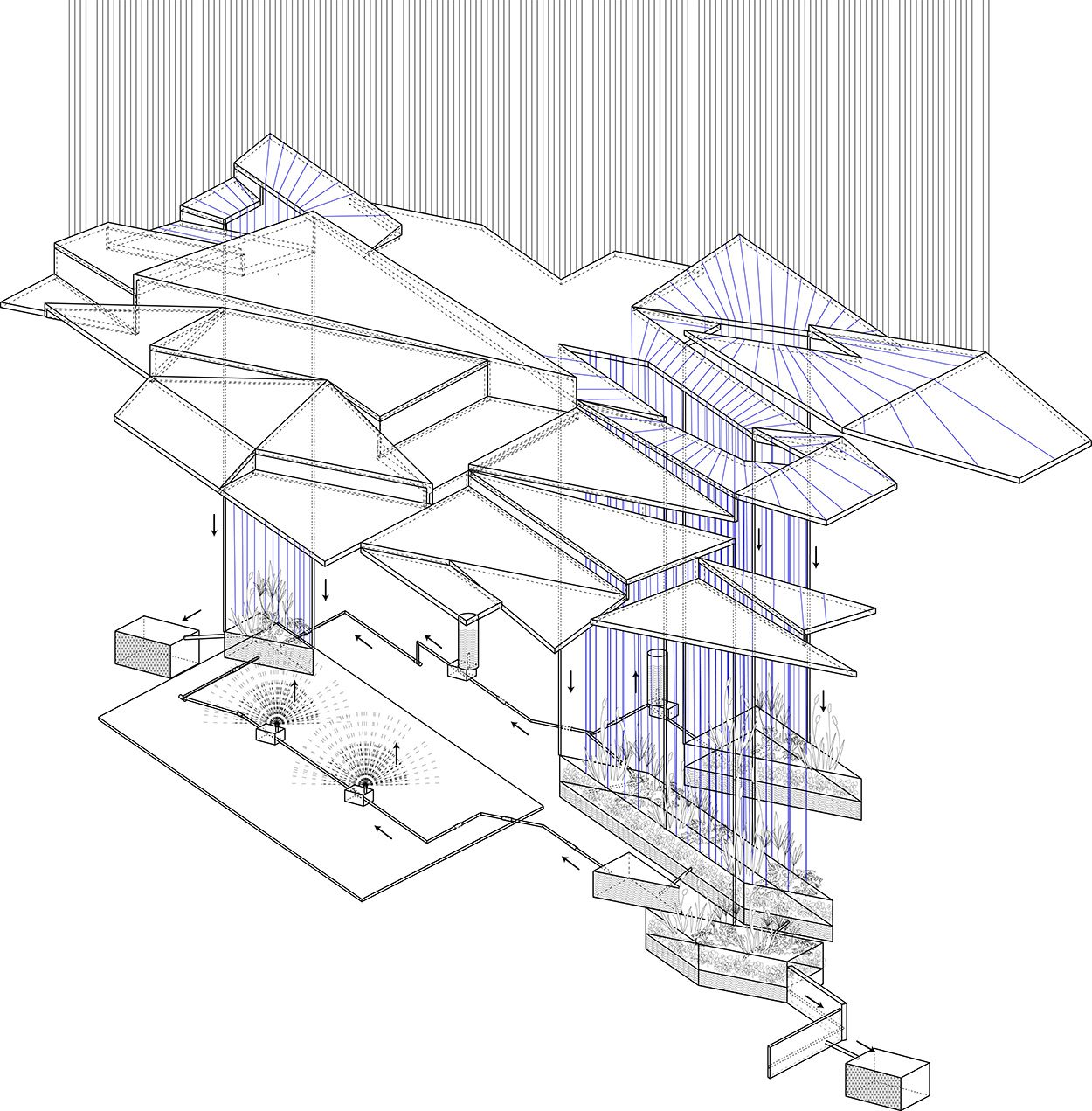 This field house integrates an indoor soccer field with sustainable design, responding to Ann Arbor’s environmental and social contexts. Inspired by the RiverSafe Project, it features a rain garden that enhances water infiltration and ecological education. A community sauna utilizes greywater for heat storage, promoting circular sustainability. Positioned near the Huron River, the design fosters a deep connection between architecture, nature, and community, transforming the space into a hub for environmental engagement and conservation.