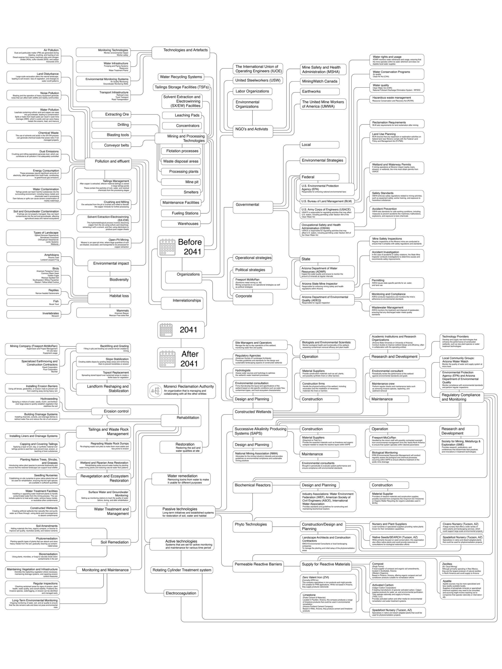 The Morenci copper mine is scheduled to close in 2040. In accordance with The Surface Mining Control and Reclamation Act of 1977, funding has been set aside to fund the site’s “Reclamation” – a process by which the site is returned to its original contour and condition. This proposal creates a national monument to preserve the vast and sublime excavated landscape. Remediation activities are staged over long timeframes to process toxic substances concentrated in the waters of the site. A series of architectures enable visitation and contemplation of this profound landscape as it transforms over time, teaming with new ecologies.