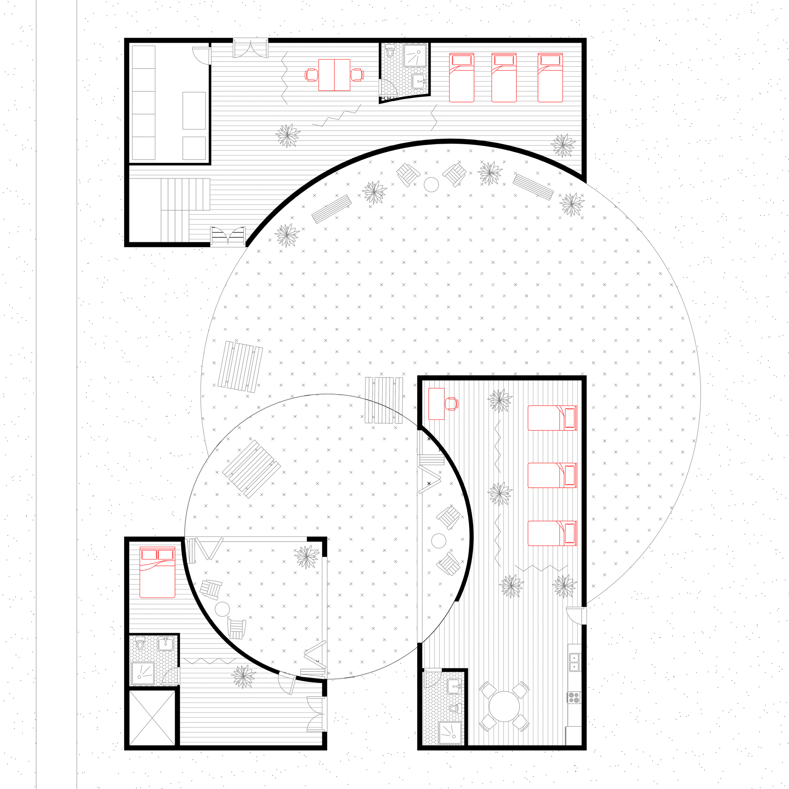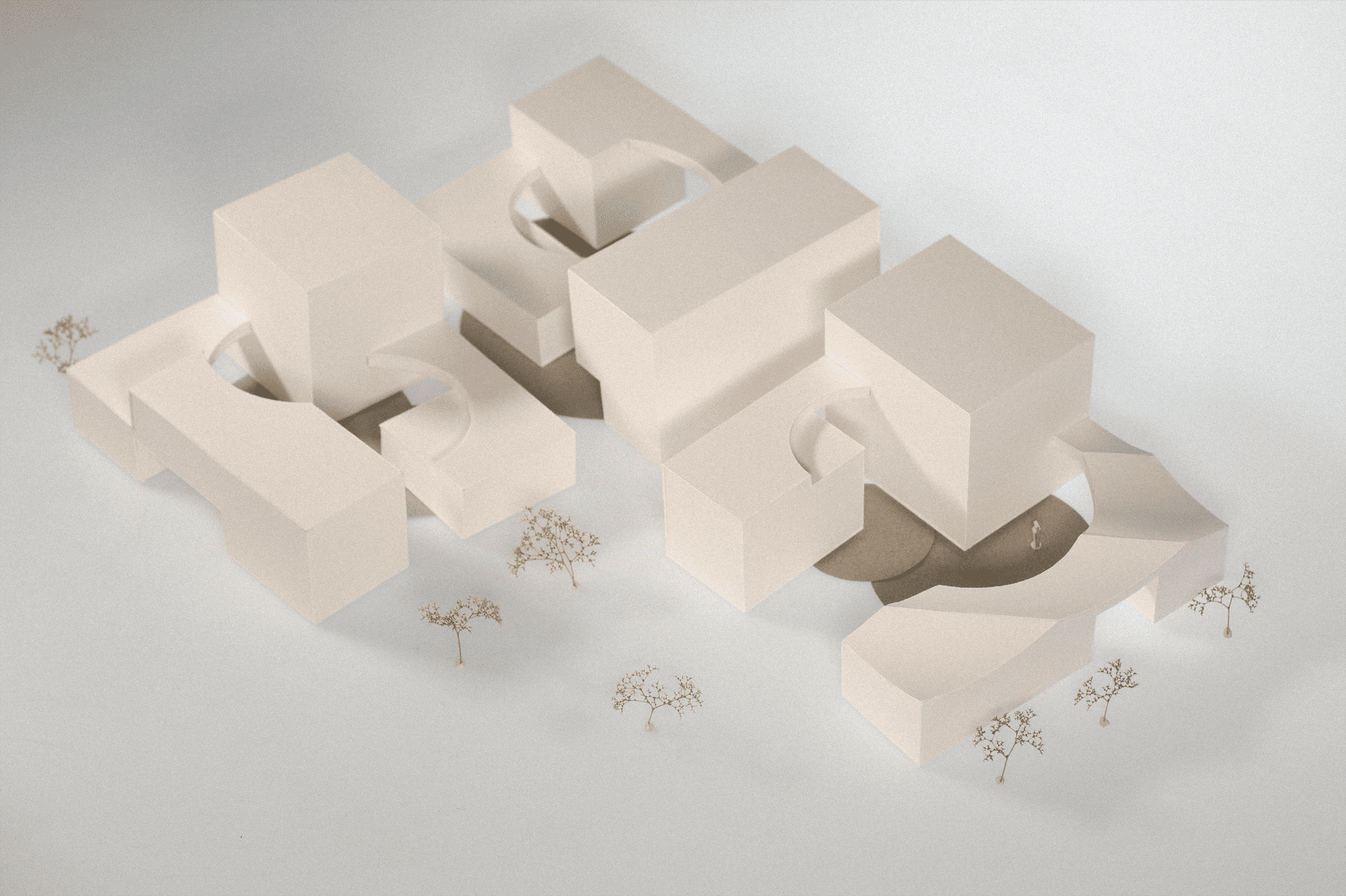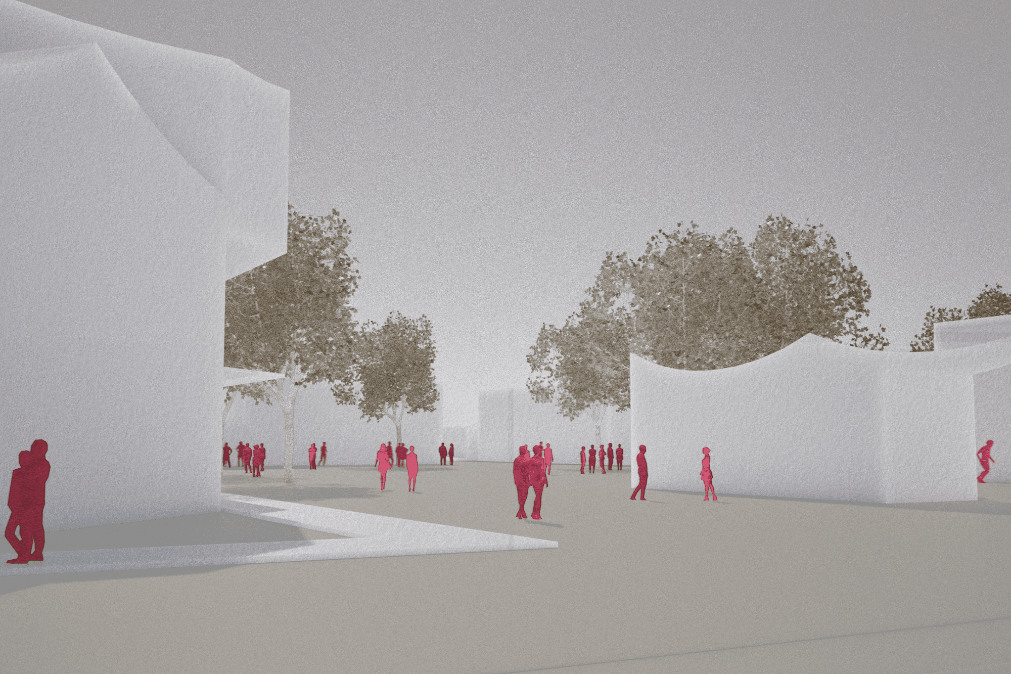 By definition, temporary housing is designed for temporary occupancy. However, for people who have been displaced from their homes, “temporary” often fails to meet their needs. Our communal housing project explores how form can afford a space for collective living, capable of rapidly fluctuating levels of occupancy relative to community need. A shelter meant to become a permanent home but also a permanent home that can provide shelter. Three clusters, each with different formal languages overlapping at points of intersection and entry, all revolve around a collective green space, and central mission of providing housing to those in need.