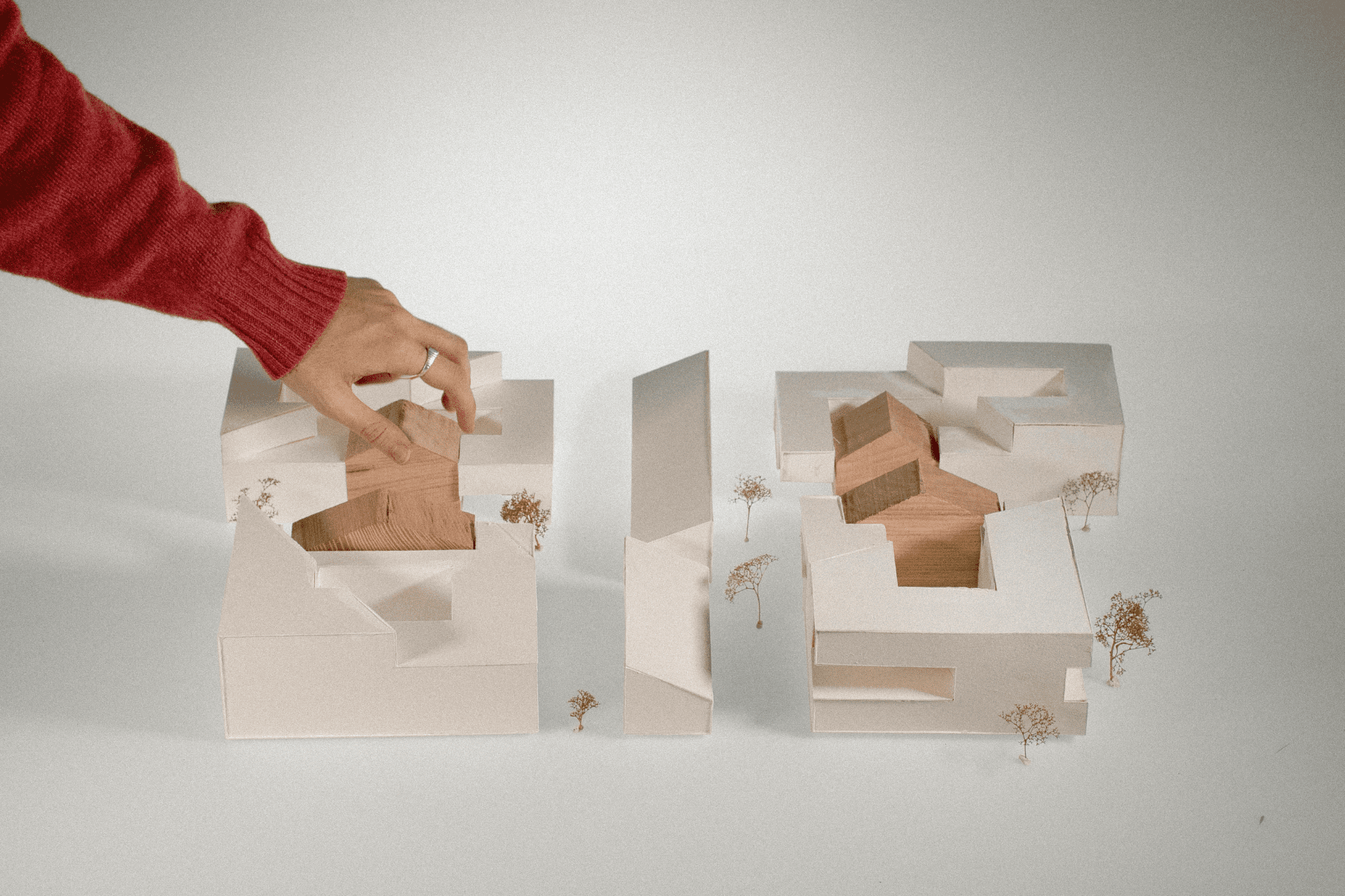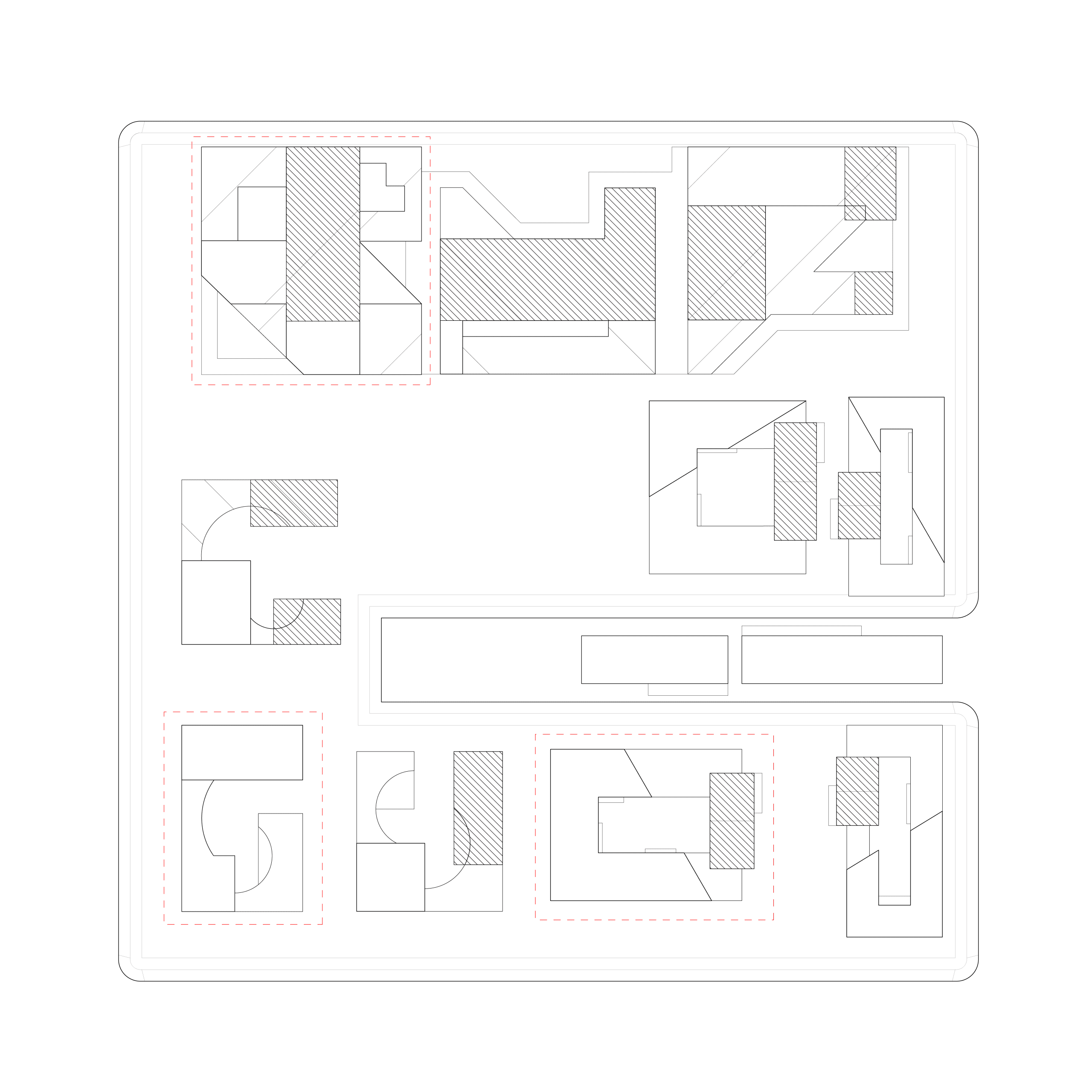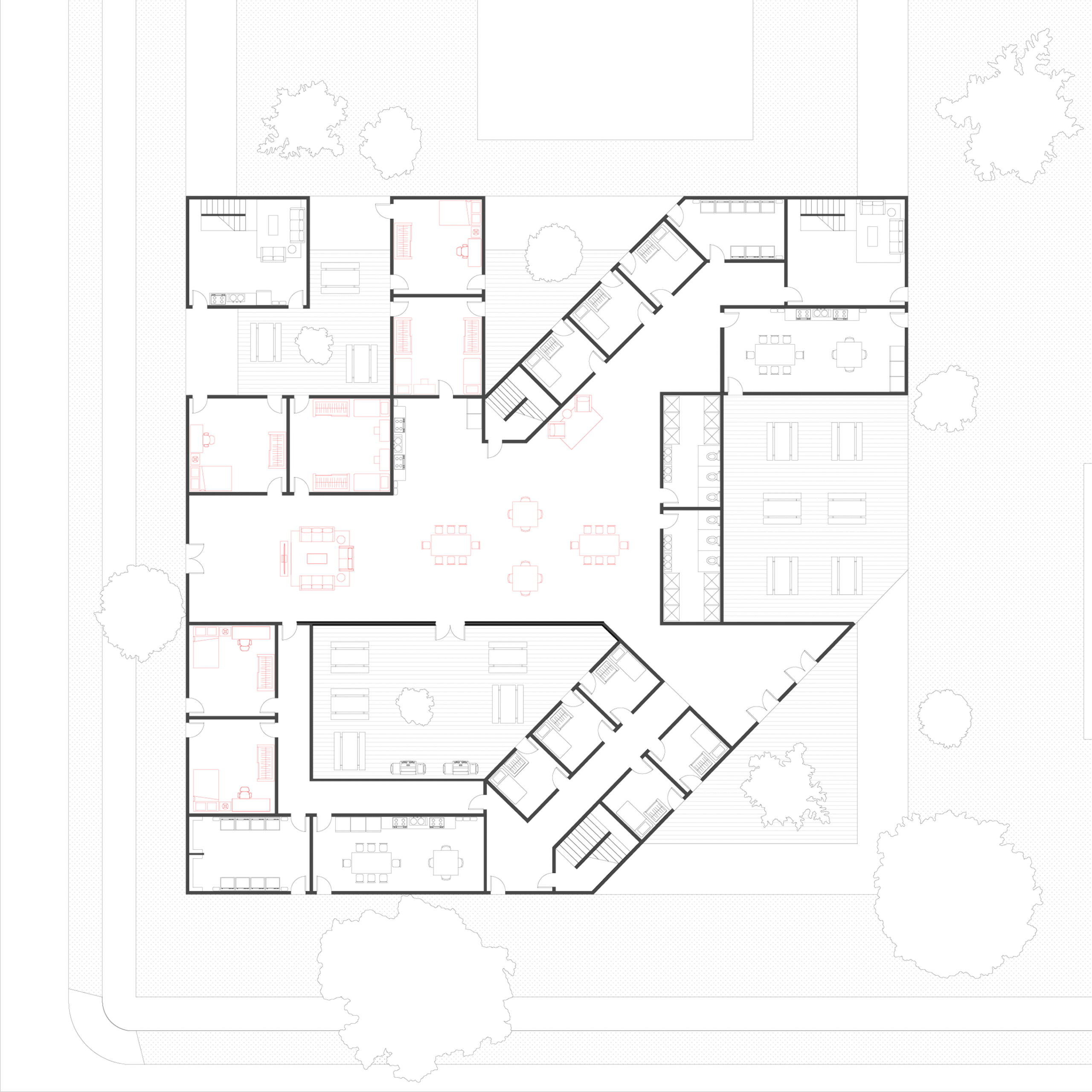 By definition, temporary housing is designed for temporary occupancy. However, for people who have been displaced from their homes, “temporary” often fails to meet their needs. Our communal housing project explores how form can afford a space for collective living, capable of rapidly fluctuating levels of occupancy relative to community need. A shelter meant to become a permanent home but also a permanent home that can provide shelter. Three clusters, each with different formal languages overlapping at points of intersection and entry, all revolve around a collective green space, and central mission of providing housing to those in need.