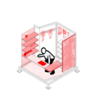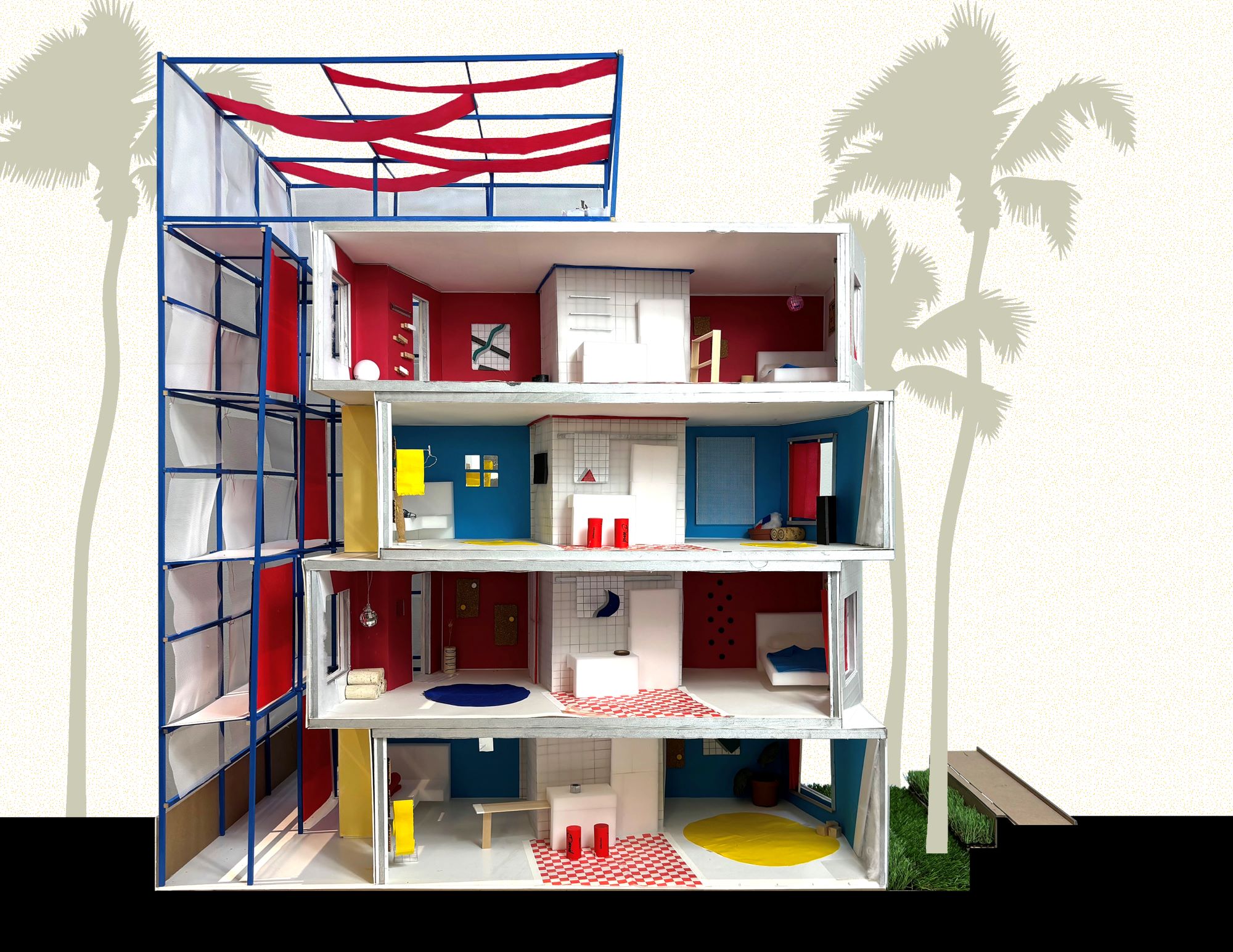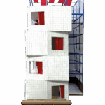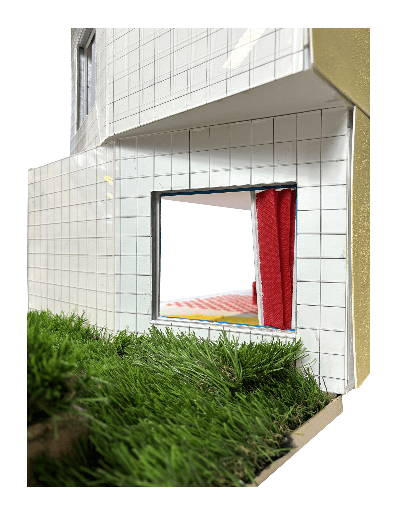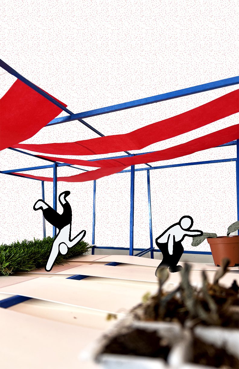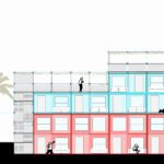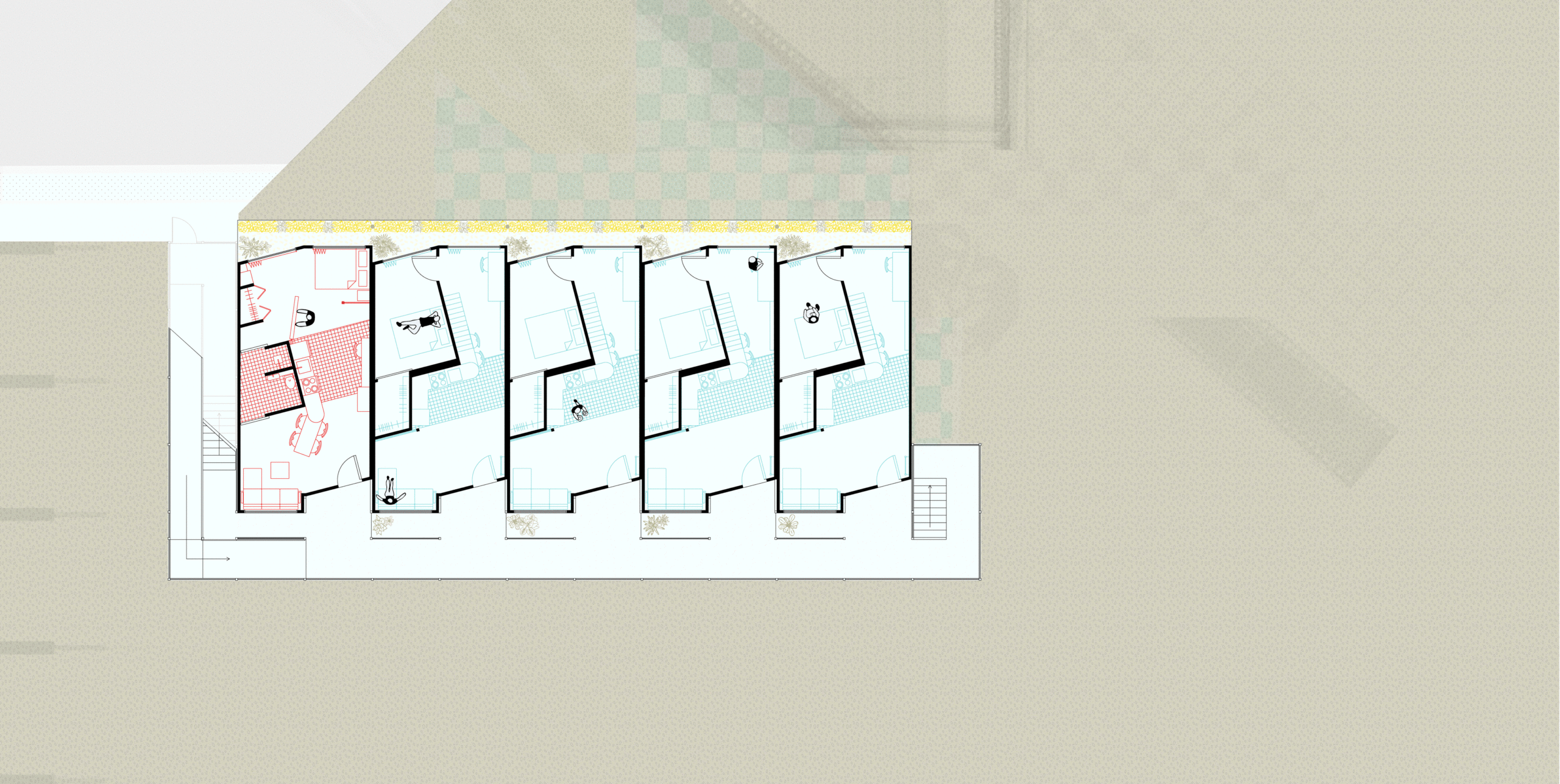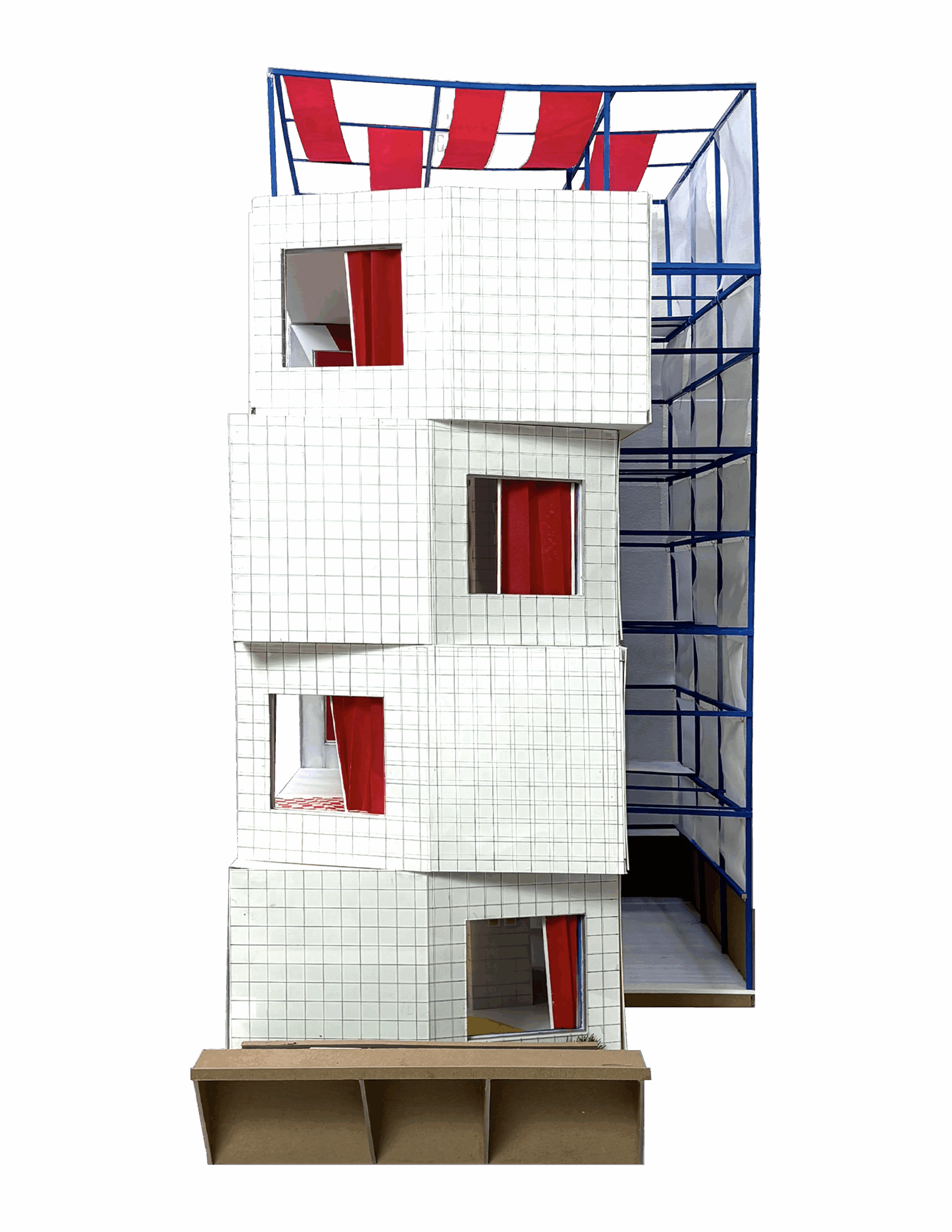 The Fourth Corner enhances the BVCLT community by extending its central plaza and completing the square. Embracing the kitbash aesthetic, it features an open steel frame around prefabricated, cost-effective residential units. The northern plaza hosts market booths, workshops, and a flexible gathering space, allowing community-driven programming. Two stairways provide access to ten studio units, four two-bedroom units, and an ADA-accessible studio via a southern ramp. Customizable interiors include movable bookcases and countertops, while two-bed units offer a double-height space and garden level for natural light and contextual integration.