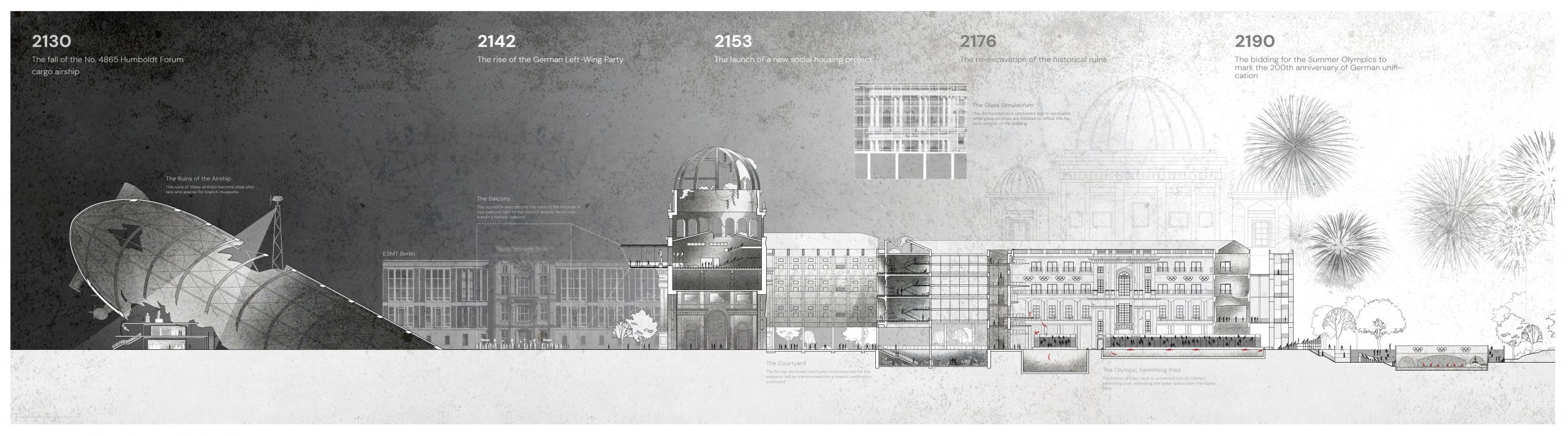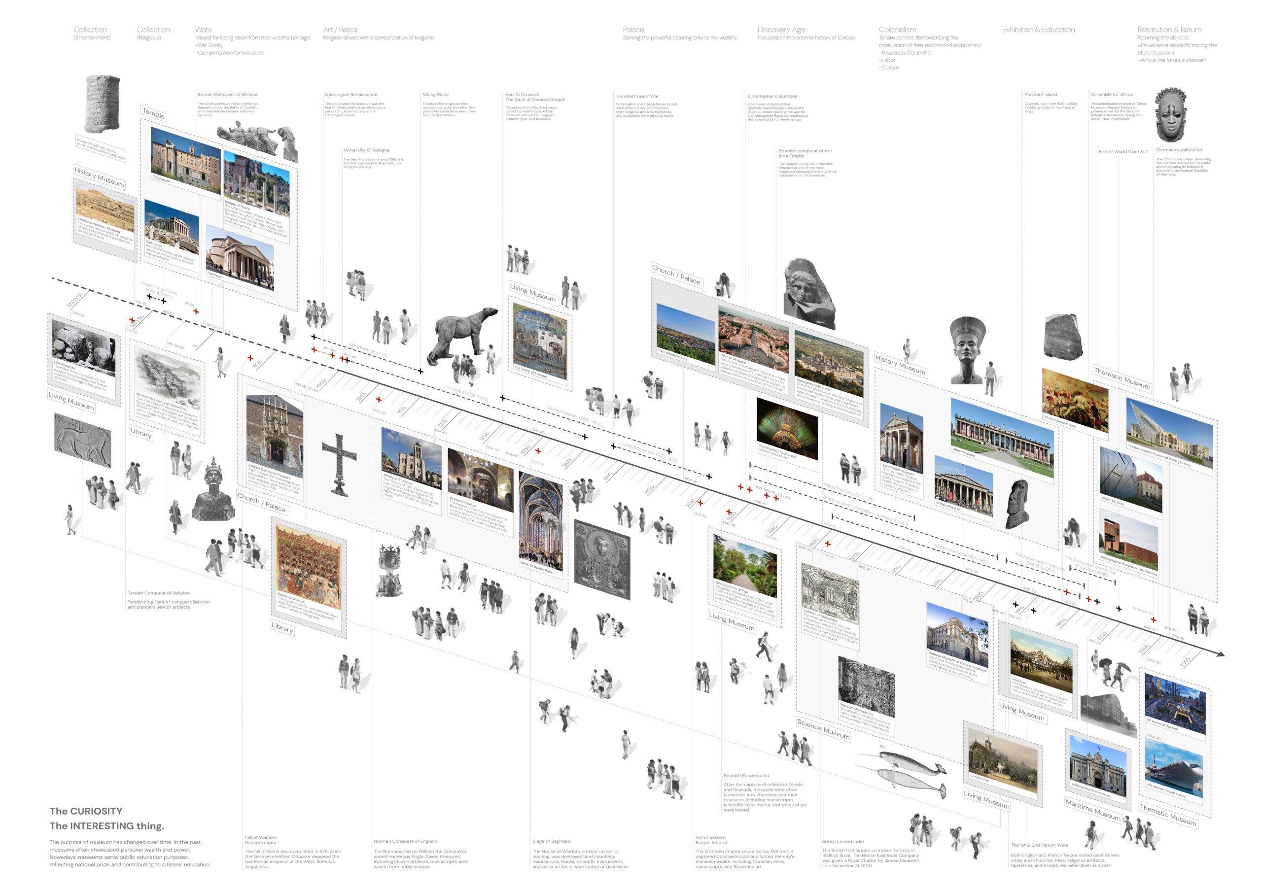 The purpose of museum collections has shifted, along with museum architecture and meaning. But when visiting history museums, have you ever wondered why these artifacts are there? Issues like looted art, exclusionary architecture, and colonial-era acquisitions remain neglected. My aim is to critique these issues. Once artifacts are returned and the symbols of colonialism are deconstructed, what will be the future of museums? I envision the Humboldt Forum as an artifact itself, undergoing a 100-year deconstruction into “The Third Ruins.” This process of deconstruction, critique, and the return of historical items will become part of the exhibition and a manifesto.…